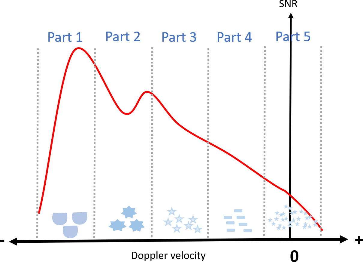 Figure 1Illustration of an idealized Doppler spectrum containing five different hydrometeor types. The division into five parts enables the potential identification of up to five different hydrometeor types; however, the actual number of retrievable distinct types depends on the spectral and microphysical characteristics of the observed cloud. Positive Doppler velocities indicate the impact of turbulent motion on the Doppler spectrum.