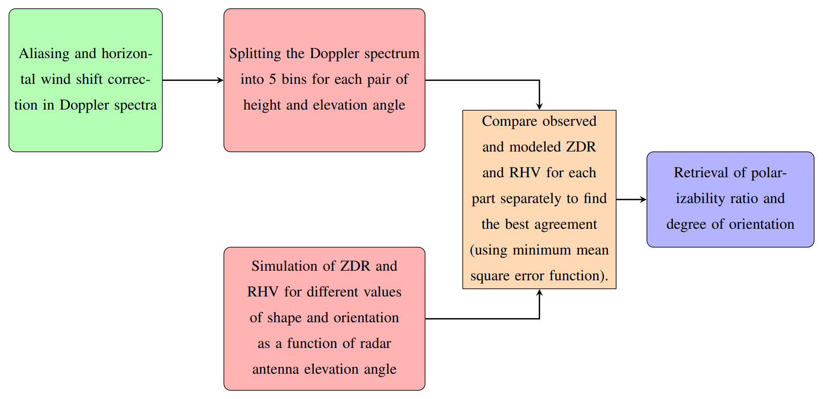 In the main-peak approach, the core idea is to study how two key radar measurements – differential reflectivity (ZDR) and correlation coefficient (RHV) – change with elevation angle at different heights in the atmosphere. These measurements are then compared with simulated values based on a spheroid model that assumes the particles are shaped like spheroids (3D ellipsoids) and that Rayleigh scattering applies. The goal is to find the best match between the real radar data and the model predictions. The introduction of the retrieval method, error analysis approach, as well as its evaluation are presented in detail by Myagkov et al. (2016a). For the sake of space we kindly point the reader to their publication for obtaining deep insights into the technique. Here, we only provide a general introduction of the retrieval.