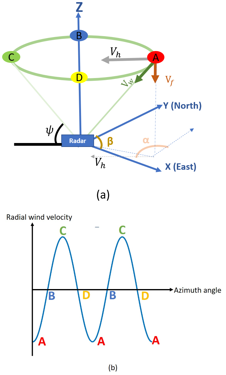 Figure 3Representation of the horizontal wind vector by means of a PPI scan, showcasing the elevation angle ψ, wind speed vector Vh, wind direction angle α, and radial wind velocity VW. (a) Illustration of the location of the four data points A, B, C, and D, which are orthogonal and perpendicular to the horizontal wind vector, respectively. (b) Angular relationship between the horizontal wind vector and the azimuth angle.