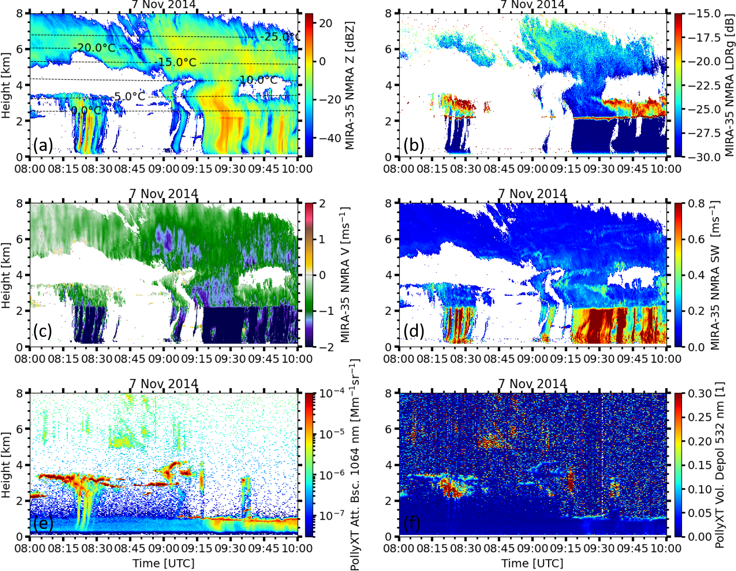 A complex cloud system that was observed on 7 November 2014, in Cabauw, the Netherlands, is introduced in Fig. 4. Figure 4 is divided into six panels. Figure 4a through d present key radar moments measured by the vertically pointing MIRA-35 NMRA cloud radar, including radar reflectivity (Fig. 4a), linear depolarization ratio (LDR) (Fig. 4b), Doppler velocity (Fig. 4c), and spectral width (Fig. 4d). These parameters provide insight into the microphysical and dynamical properties of the observed cloud structures. Reflectivity and LDR offer information on particle size and shape, while Doppler velocity and spectral width reflect the vertical motion and turbulence within the cloud. Complementary lidar measurements from the PollyXT system are shown in Fig. 4e and f, displaying the attenuated backscatter coefficient at 1064 nm and the volume depolarization ratio at 532 nm, respectively.