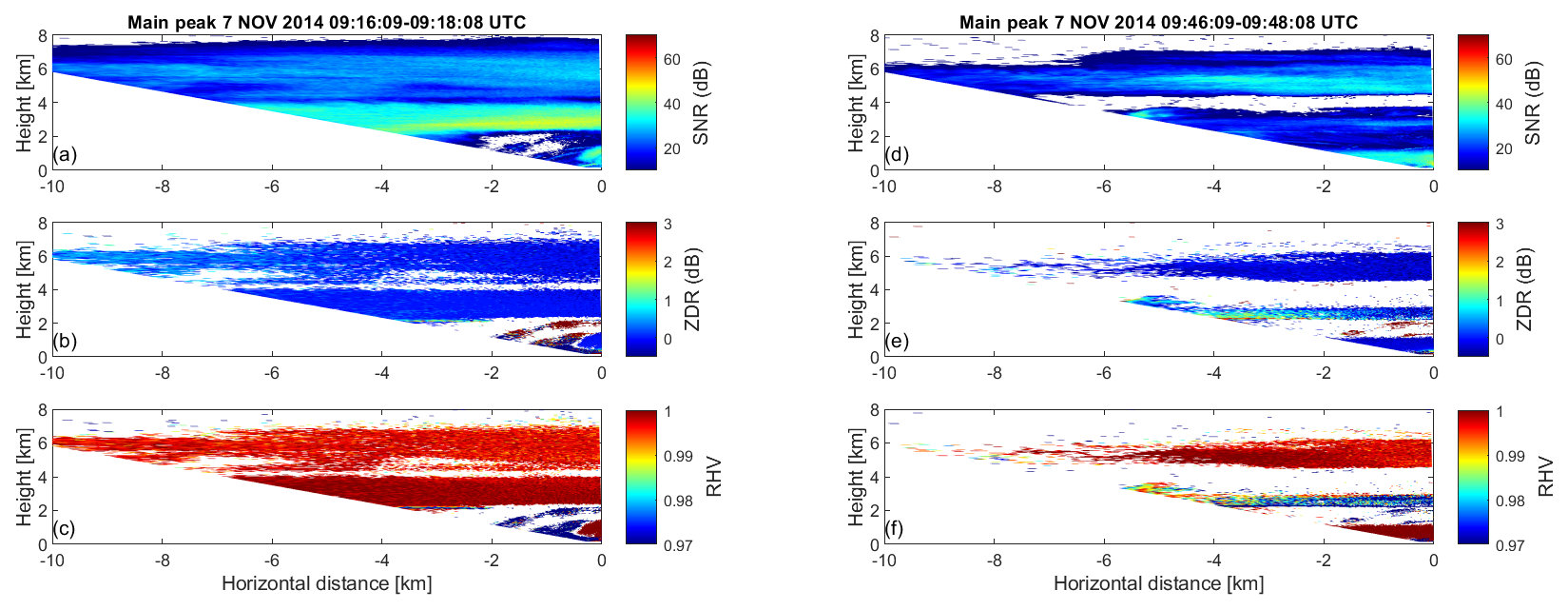 Figure 5Left: height vs. distance cross-sections of (a) maximum SNR, (b) ZDR, and (c) RHV as derived from a maximum SNR of Doppler spectra of the RHI scan of MIRA-35 MBR4 performed at Cabauw, NL, on 7 November 2014, 09:16–09:18 UTC. Right: (d) maximum SNR, (e) ZDR, and (f) RHV as derived from a maximum SNR of Doppler spectra of the RHI scan of MIRA-35 MBR4 performed at Cabauw, NL, on 7 November 2014, 09:46–09:48 UTC.