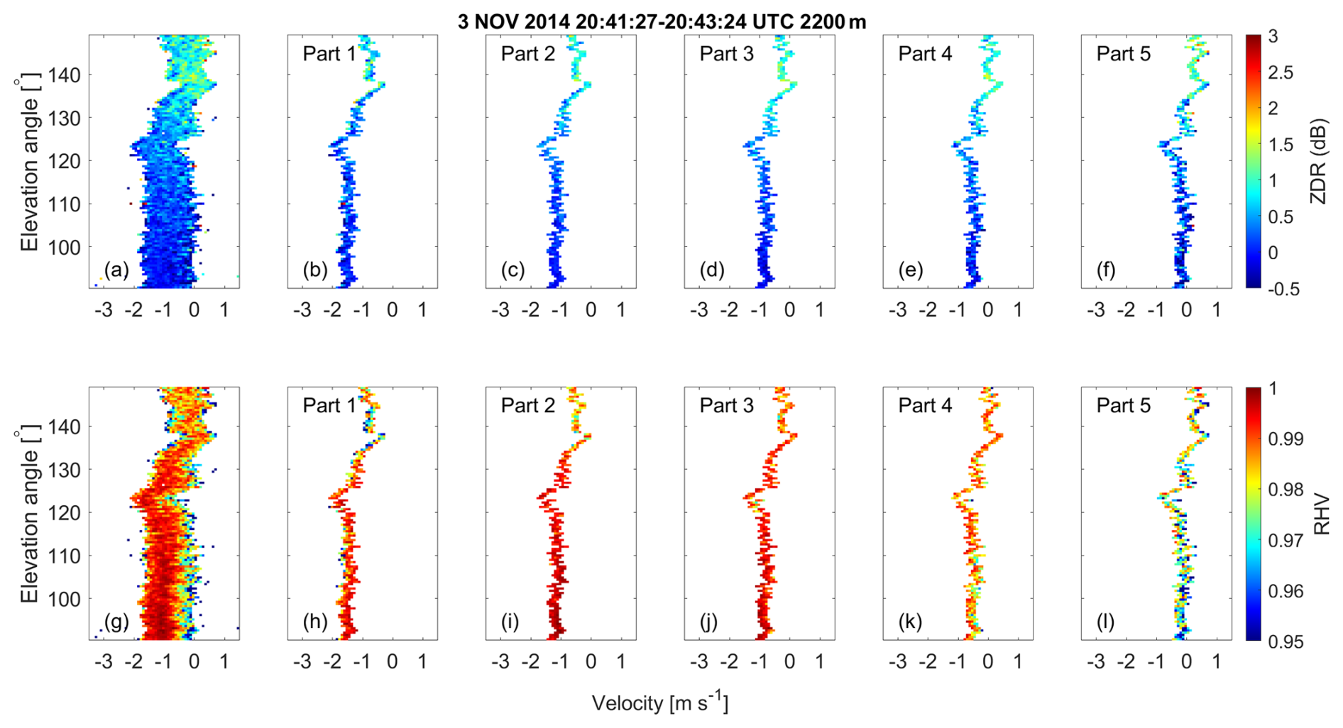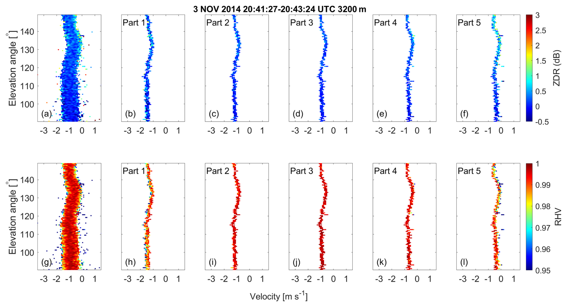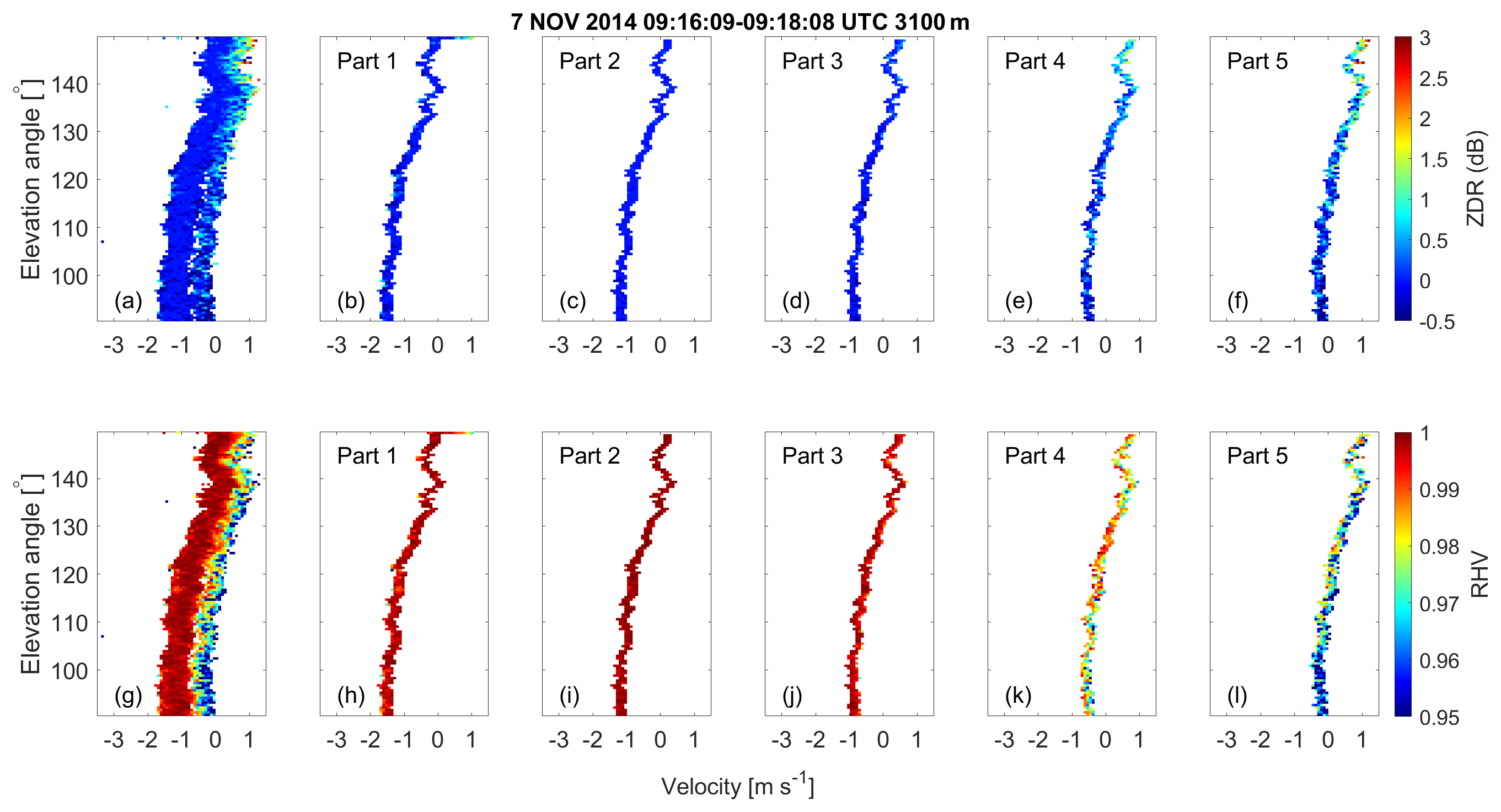 Figure 8Doppler spectra of ZDR and RHV as a function of elevation angle and for each part of the spectrally resolved spectra, shape, and orientation retrieval as obtained for 3.1 km height on 7 November 2014, at the time period 09:16:09–09:18:08 UTC. (a) ZDR spectrum before segmentation, (b–f) ZDR spectrum in parts 1 to 5 after splitting, (g) RHV spectrum before splitting, and (h–l) RHV spectrum in parts 1 to 5 after splitting.
