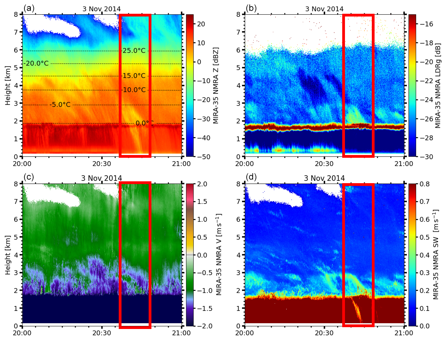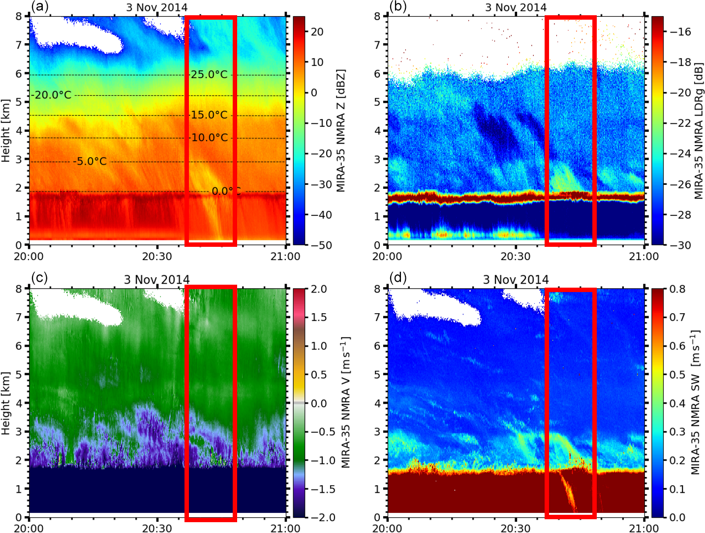 Figure 10(a) Radar reflectivity, (b) LDR, (c) Doppler velocity, and (d) spectral width measured by the MIRA-35 NMRA. The highlighted period (20:37–20:47 UTC) and altitude range (0–8000 m) signify the focus of the case study where shape retrievals are applied.