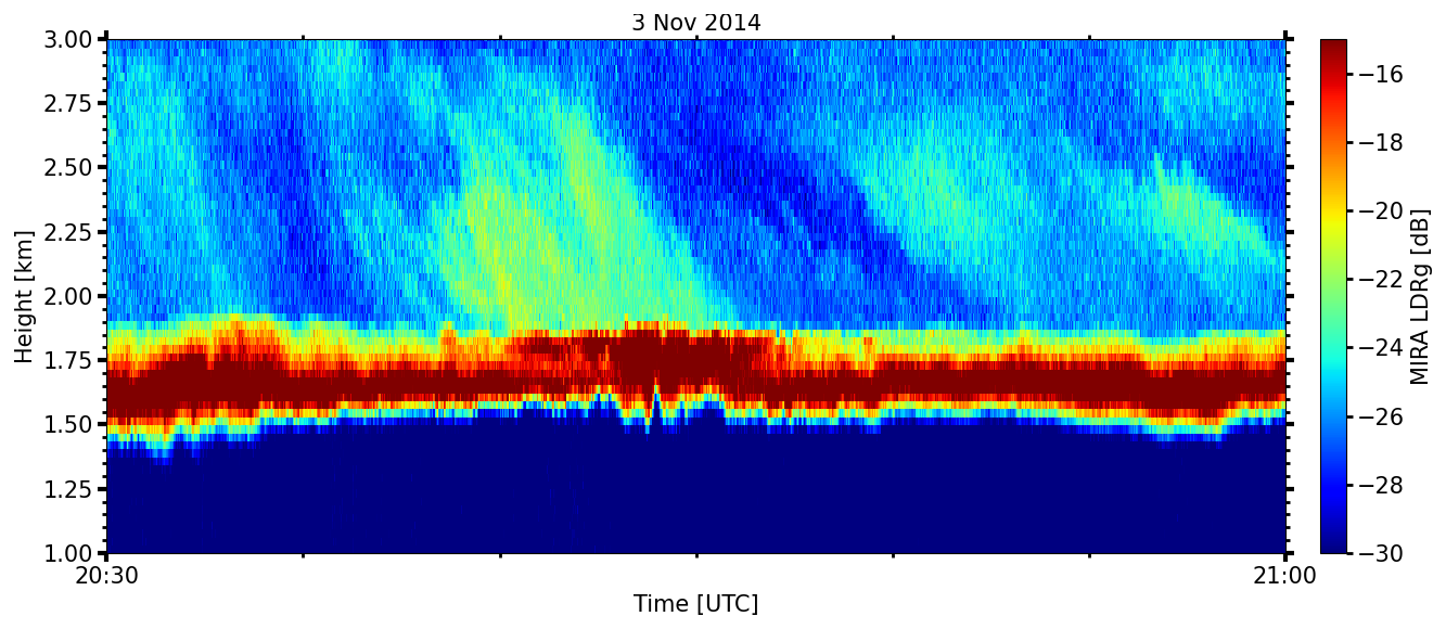 Figure 13Time–height cross-section of LDR observed by MIRA-35 NMRA during the time interval from 20:30 to 21:00 UTC on 3 November 2014, in Cabauw, the Netherlands. Elevated LDR signatures were detected at altitudes from above the melting layer and 2.75 km height during the time period from 20:40–20:47 UTC.