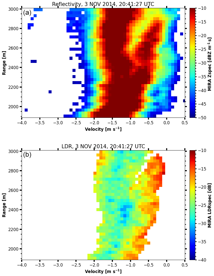 Figure 14Profiles of Doppler spectra of (a) radar reflectivity and (b) LDR at 20:41:27 UTC, on 3 November 2014, measured by MIRA-35 NMRA in Cabauw, the Netherlands.