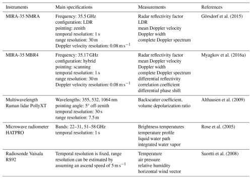 The ACCEPT measurement campaign was led by the Leibniz Institute for Tropospheric Research (TROPOS) in Leipzig, Germany, with partners from the Technical University of Delft and METEK GmbH in Elmshorn, Germany. One of its goals was to explore the polarimetric capabilities of the MIRA-35 cloud radar. A second objective was the study of ice particle growth processes in mixed-phase clouds using spectral polarimetric S-band radar measurements (Pfitzenmaier et al., 2017, 2018). The campaign took place at the Cabauw Experimental Site for Atmospheric Research (CESAR) in the Netherlands from 7 October to 18 November 2014. Table 1 provides a comprehensive list of the instruments utilized specifically for this study. Two Doppler cloud radars of type MIRA-35 (Görsdorf et al., 2015) were installed and operated during the campaign to cover different objectives. One MIRA-35 (MIRA-35 MBR4) configured in hybrid polarimetric mode (simultaneously transmitting and receiving signals across both horizontal and vertical channels.) was integrated into the LACROS (Leipzig Aerosol and Cloud Remote Observations System; Bühl et al., 2013) container at CESAR. It performed 15 min scanning cycles, including two RHI scans per cycle, covering elevation angles from 30 to 150 ° at two perpendicular azimuth angles: 0 ° (north–south) and 90 ° (east–west), with a scanning speed of 0.5 ° s−1. Additionally, each cycle included one PPI (plan position indicator) scan, sweeping azimuth angles from 0 to 360 ° at two elevation angles (75 and 105 °), at a scanning speed of 0.3 ° s−1. This system was described in detail by Myagkov et al. (2016a). The radar's accuracy was ensured through antenna coupling corrections and occasional calibration using light rain events (Myagkov et al., 2015, 2016a). Another MIRA-35 radar (MIRA-35 NMRA), with a linear depolarization configuration (LDR), operated simultaneously in continuous vertical-stare mode to observe cloud systems. To prevent interference, the two radars operated slightly at different frequencies (see Table 1) and were positioned 30 m apart. A PollyXT multiwavelength Raman lidar (Engelmann et al., 2016) was used to detect supercooled liquid particles in mixed-phase clouds near the Cabauw meteorological tower. The lidar was strategically tilted by 5 ° off-zenith to avoid specular reflection at the planar planes of horizontally oriented falling ice crystals (Westbrook et al., 2010). Cloud-top temperatures were determined from the thermodynamic profiles of the atmosphere derived by various methods, including radiosondes, microwave radiometer, and the GDAS1 model dataset, with priority on the first available dataset in the given order (Myagkov et al., 2016b).