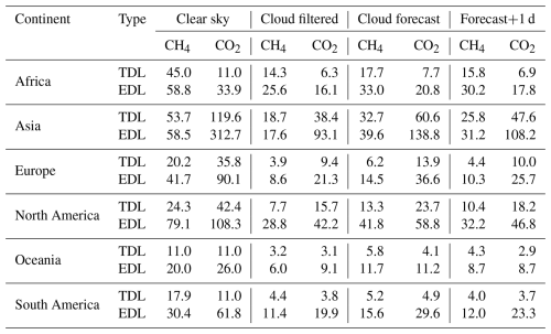 Table A1Average number of CH4 and CO2 targets detected per 4 d interval across continents under CH4 prioritization for TDL and EDL detection limits.