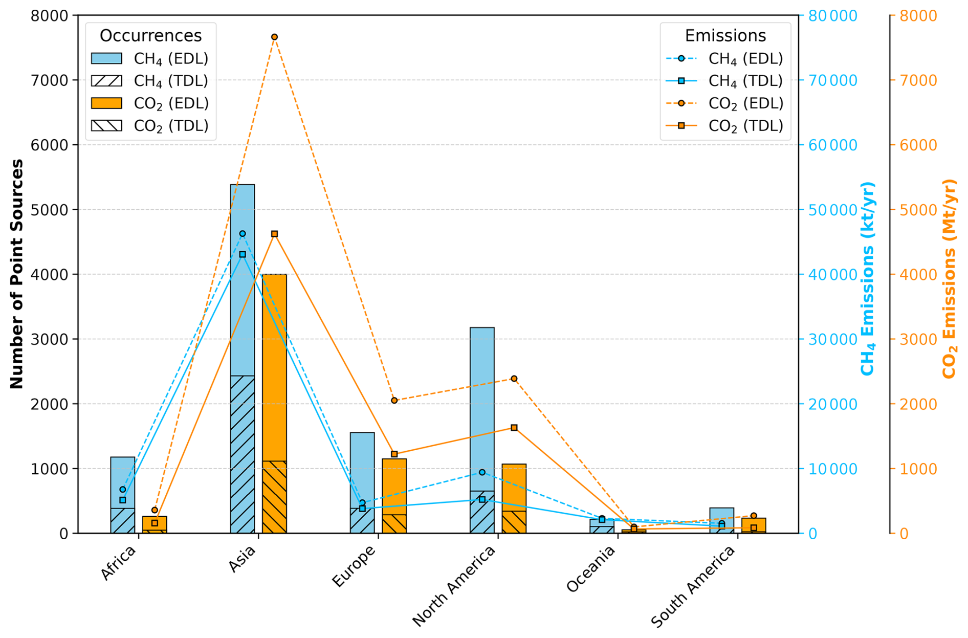 An overview of the spatial distribution of TDL and EDL point sources across continents is shown in Fig. 2. Under TDL thresholds, the inventory includes significant emitters across all continents. For instance, in Asia, 1114 CO2 sources account for 4623.76 Mt yr−1 of regional emissions, while in North America, 652 CH4 sources contribute 5215.88 kt yr−1. These numbers reflect the major emitters detectable within TDL, offering insights into the satellite’s immediate operational capabilities.