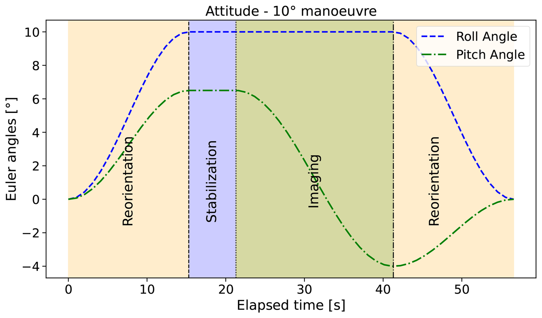 Figure 3Schematic illustration of TANGO's dynamic manoeuvrability using roll and pitch adjustments during an observational cycle. The plot represents a 10° roll manoeuvre, showing key stages of satellite operation: reorientation, stabilization, and imaging.