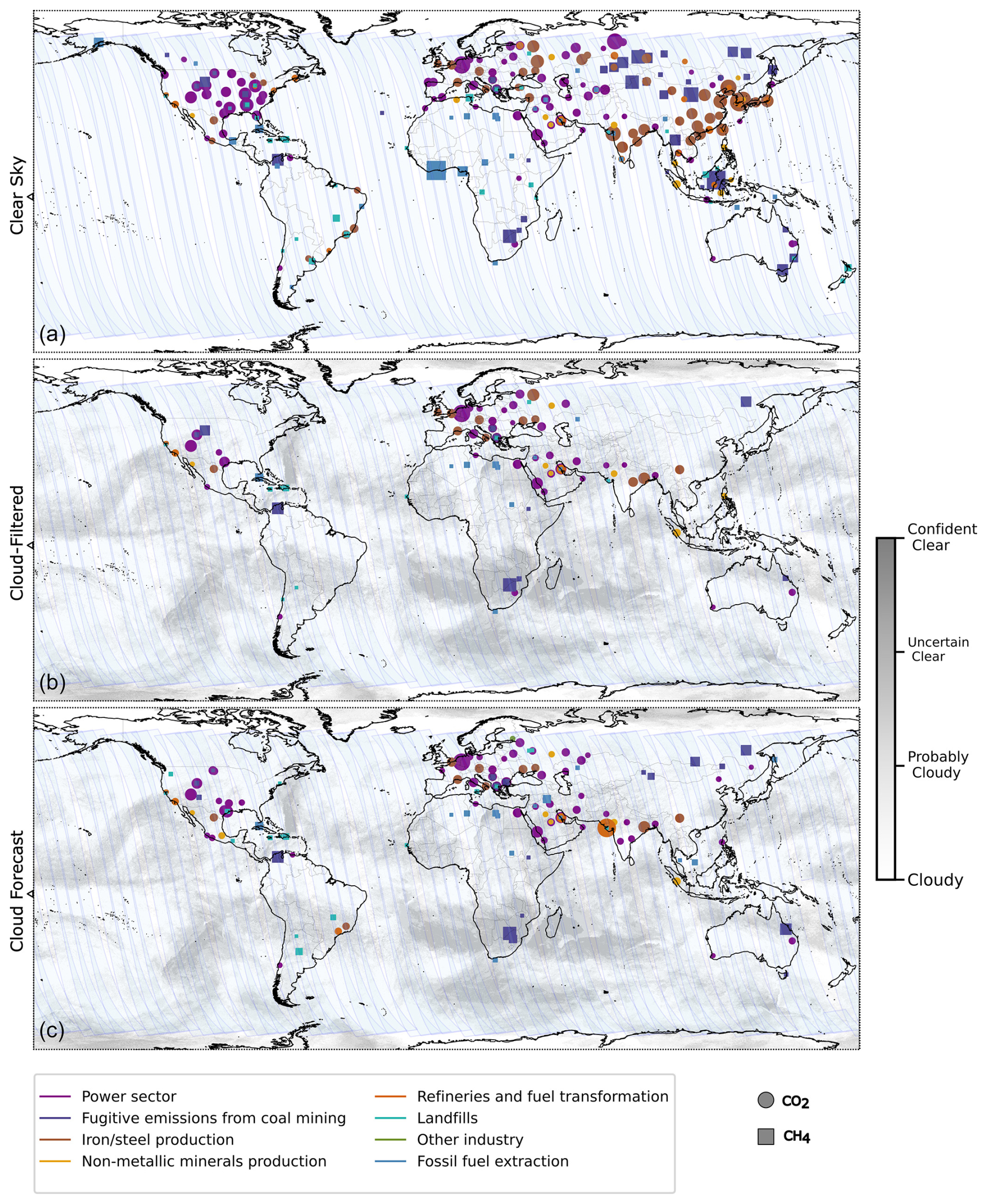 Figure 5Global distribution of detected CO2 and CH4 point sources based on a 4 d simulation period from 18–22 March 2022, under three scenarios: (a) clear sky, (b) cloud filtered, and (c) cloud forecast for TDL simulations. Detected targets are colour-coded by emission sector, with CO2 sources represented by circles and CH4 sources by squares. Marker size is scaled to emission strength within each gas type. Overlaid cloud coverage is categorized as confidently clear, uncertainly clear, probably cloudy, and confidently cloudy, based on MODIS cloud mask data. The light blue bands indicate the width of the satellite's trajectory, encompassing TANGO’s maximum roll angle.