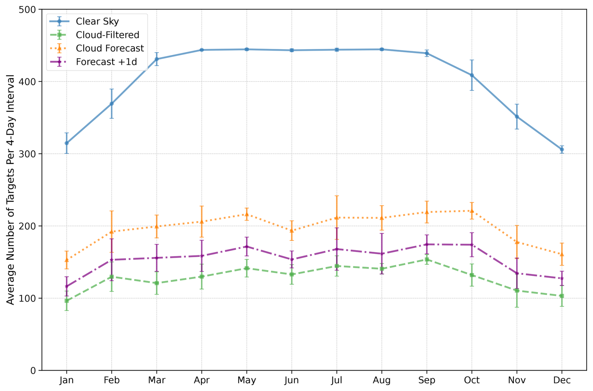 Integrating cloud-forecast data in the cloud-forecast scenario further improves detection outcomes relative to the cloud-filtered scenario. For TDL, the cloud-forecast scenario achieves a yearly average of 272 ± 5 targets, marking a 28 ± 3 % increase over the cloud-filtered case. Under EDL, the cloud-forecast scenario reaches 527 ± 7, representing a 32 ± 3 % improvement over the cloud-filtered case. These results underscore the combined benefit of cloud-forecast integration and enhanced detection sensitivity, which together optimize observational yield even under variable cloud conditions. For TDL, the forecast+1 d scenario yields a yearly average target of 222 ± 5, a 4.8 % increase over the cloud-filtered case. With EDL, the improvement is more pronounced, with a 7.5 % increase from 398 ± 6 to 428 ± 6 in the cloud-filtered scenario. These results demonstrate that even under a conservative estimate of forecast inaccuracy, integrating cloud-forecast data enhances the detection capabilities, maintaining resilience in achieving target detection under suboptimal conditions.