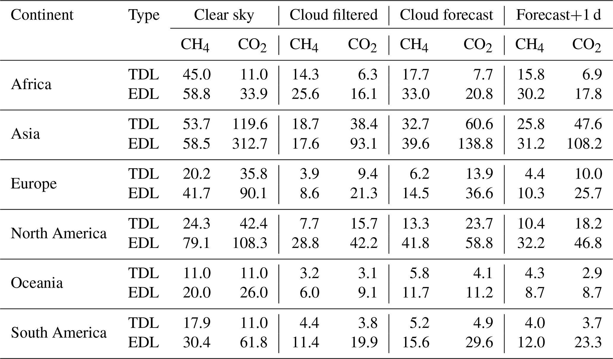 Table A1Average number of CH4 and CO2 targets detected per 4 d interval across continents under CH4 prioritization for TDL and EDL detection limits.