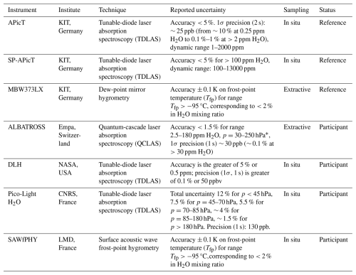 The participating instruments included (in alphabetical order) a balloon-borne laser absorption spectrometer for UTLS water research (“ALBATROSS”) by Empa, Switzerland (Graf et al., 2021; Brunamonti et al., 2023); the Diode Laser Hygrometer (DLH) by NASA, USA (Diskin et al., 2002); the Pico-Light H2O (Ghysels et al., 2024) by CNRS, France, successor of the former Pico-SDLA instrument (Durry et al., 2008); and the Surface Acoustic Wave frostPoint Hygrometer (SAWfPHY) by LMD, France. Reference instruments, all operated by KIT (Germany), included the AIDA-PCI-in-cloud-TDL (APicT) (Ebert et al., 2005), the single-path AIDA-PCI-in-cloud-TDL (SP-APicT) (Skrotzki, 2012, Sarkozy et al., 2020, Lamb et al., 2023), and the commercial chilled-mirror hygrometer MBW373LX by MBW Calibration AG (Switzerland). The main features and reported uncertainties of all instruments are summarized in Table 1.