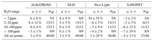 The results of the statistical comparison are presented in Fig. 6 and summarized in Table 3. Figure 6 shows the scatter plots of the mean relative difference (μ) of each instrument with respect to its reference dataset, namely ALBATROSS – RefExt (panel a), Pico-Light H2O– RefInt (b), SAWfPHY – RefInt (b), and DLH – RefInt (d), calculated for all set points of both the open and blind intercomparison. Vertical error bars show the ± 1σ range of standard deviation of the difference (calculated according to Eq. 3), while horizontal error bars show the standard deviation range of the reference H2O mixing ratio. Table 3 shows the mean values of μ ± σ for each instrument and set point of the blind intercomparison, calculated in five ranges of H2O mixing ratio, namely H2ORef<2 ppm, H2ORef=2–10 ppm, H2ORef=10–100 ppm, and H2ORef>100 ppm, as well as all data together, along with the number of set points measured by each instrument in each range (NSP). Note that the range of each set point is assigned for each participating instrument depending on the mean H2O mixing ratio of the reference instruments associated with that participant (i.e., RefExt for ALBATROSS and RefInt for all other instruments).