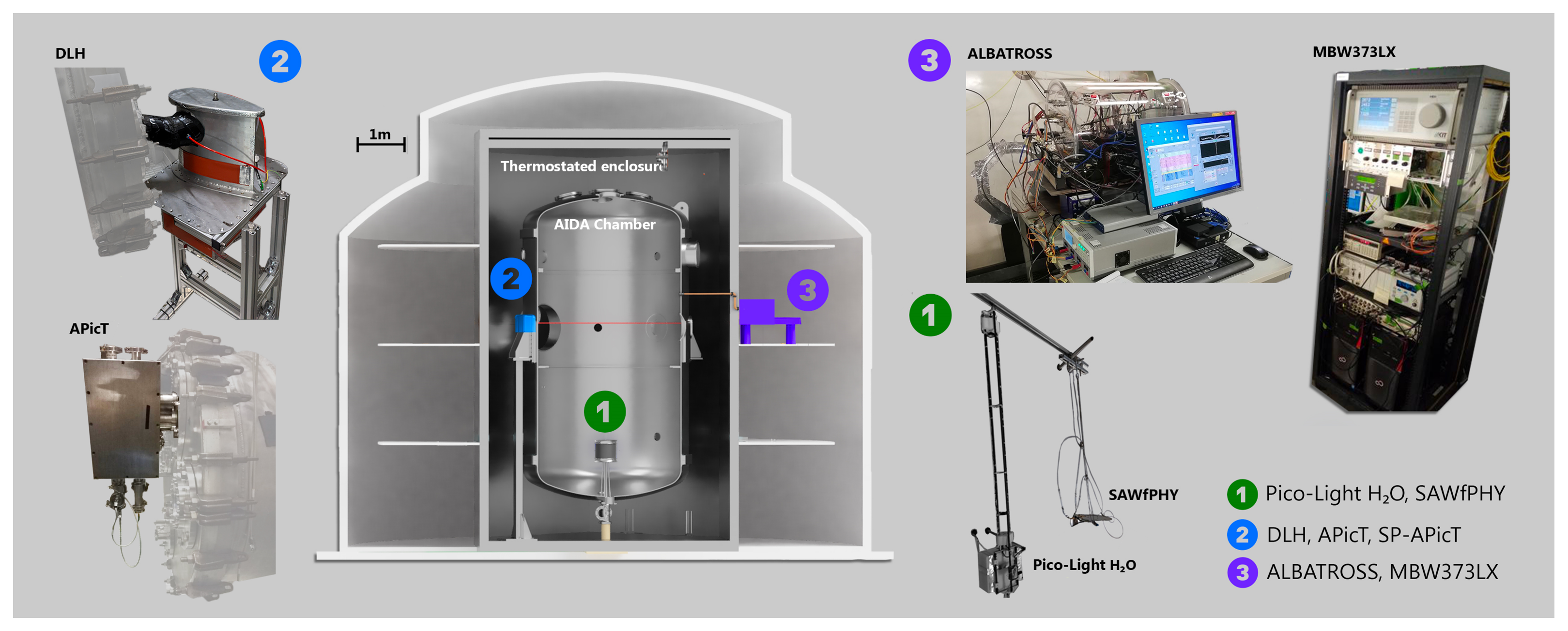 The participating instruments included (in alphabetical order) a balloon-borne laser absorption spectrometer for UTLS water research (“ALBATROSS”) by Empa, Switzerland (Graf et al., 2021; Brunamonti et al., 2023); the Diode Laser Hygrometer (DLH) by NASA, USA (Diskin et al., 2002); the Pico-Light H2O (Ghysels et al., 2024) by CNRS, France, successor of the former Pico-SDLA instrument (Durry et al., 2008); and the Surface Acoustic Wave frostPoint Hygrometer (SAWfPHY) by LMD, France. Reference instruments, all operated by KIT (Germany), included the AIDA-PCI-in-cloud-TDL (APicT) (Ebert et al., 2005), the single-path AIDA-PCI-in-cloud-TDL (SP-APicT) (Skrotzki, 2012, Sarkozy et al., 2020, Lamb et al., 2023), and the commercial chilled-mirror hygrometer MBW373LX by MBW Calibration AG (Switzerland). The main features and reported uncertainties of all instruments are summarized in Table 1.