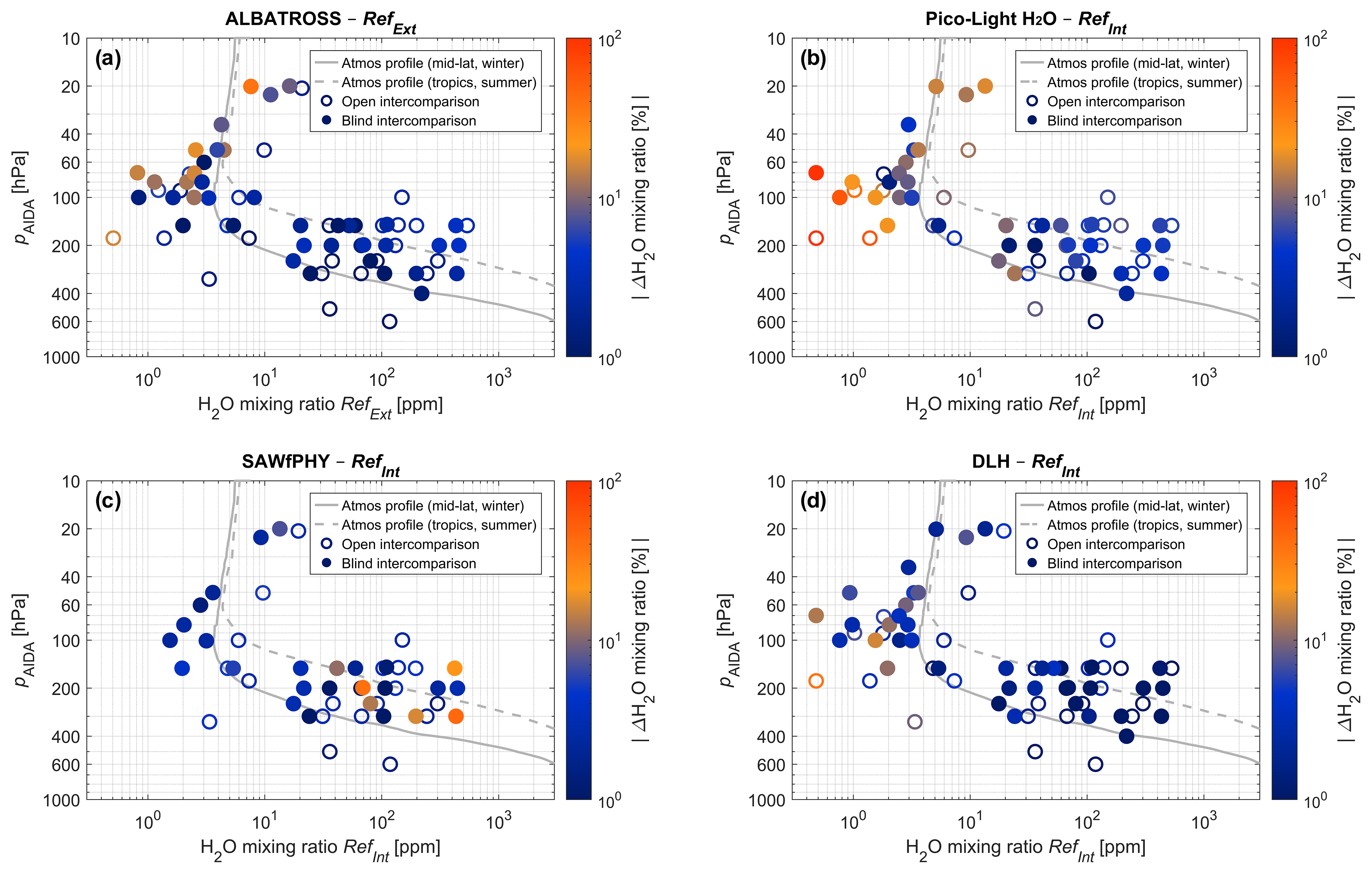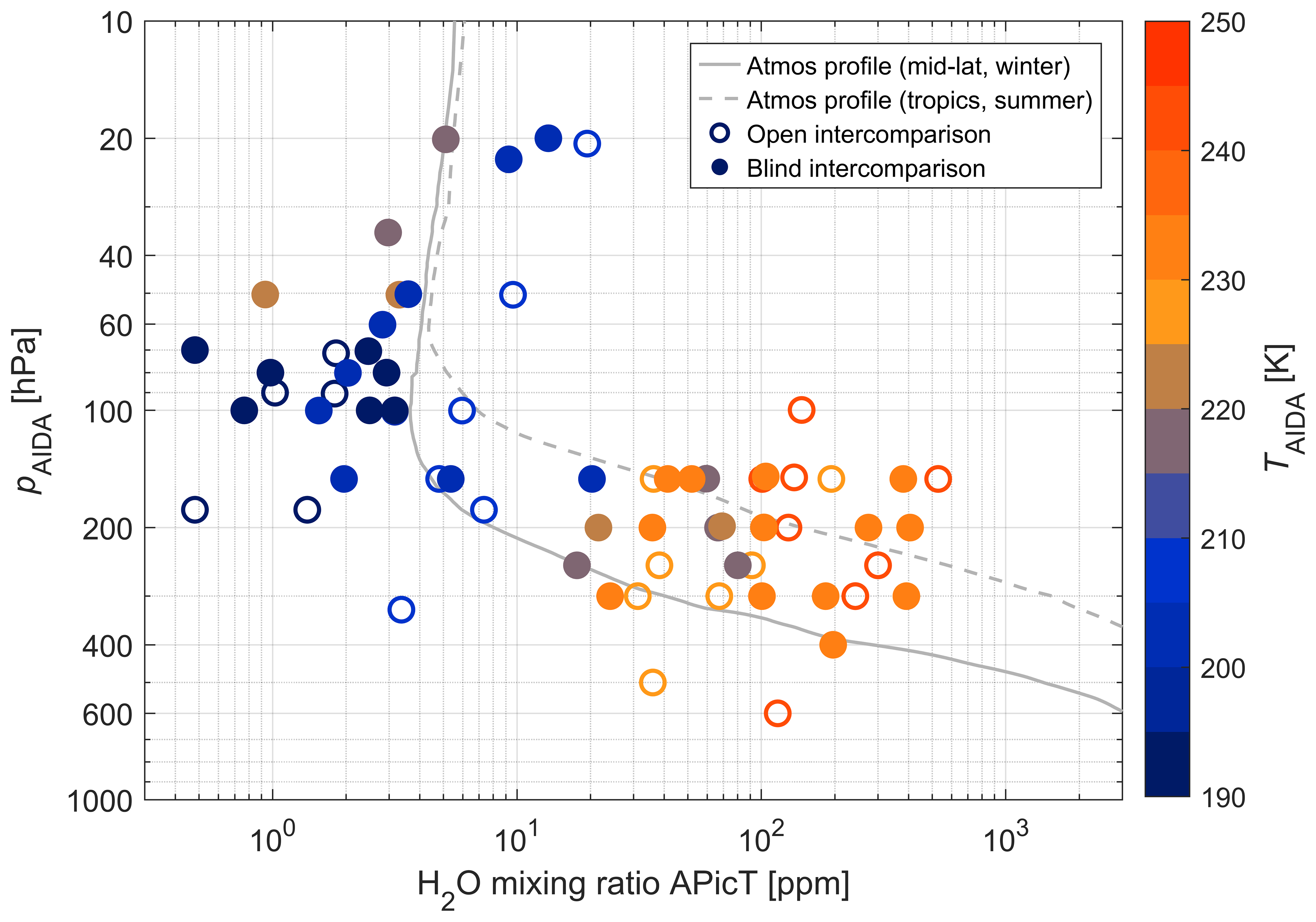 Figure 2 displays the distributions of the mean H2O mixing ratio (measured by APicT) against pAIDA and TAIDA (color-coded) of all the measured static intervals (“set points”), overlaid with two vertical profiles of H2O mixing ratio in the atmosphere. The atmospheric profiles have been measured by the CFH during recent field campaigns and correspond to moist, tropical summer conditions (dashed gray line) and dry, midlatitude winter conditions (solid gray line). Open intercomparison and blind intercomparison set points are indicated by empty and filled dots, respectively. Note that the selection of the set point intervals is described in Sect. 4.3.