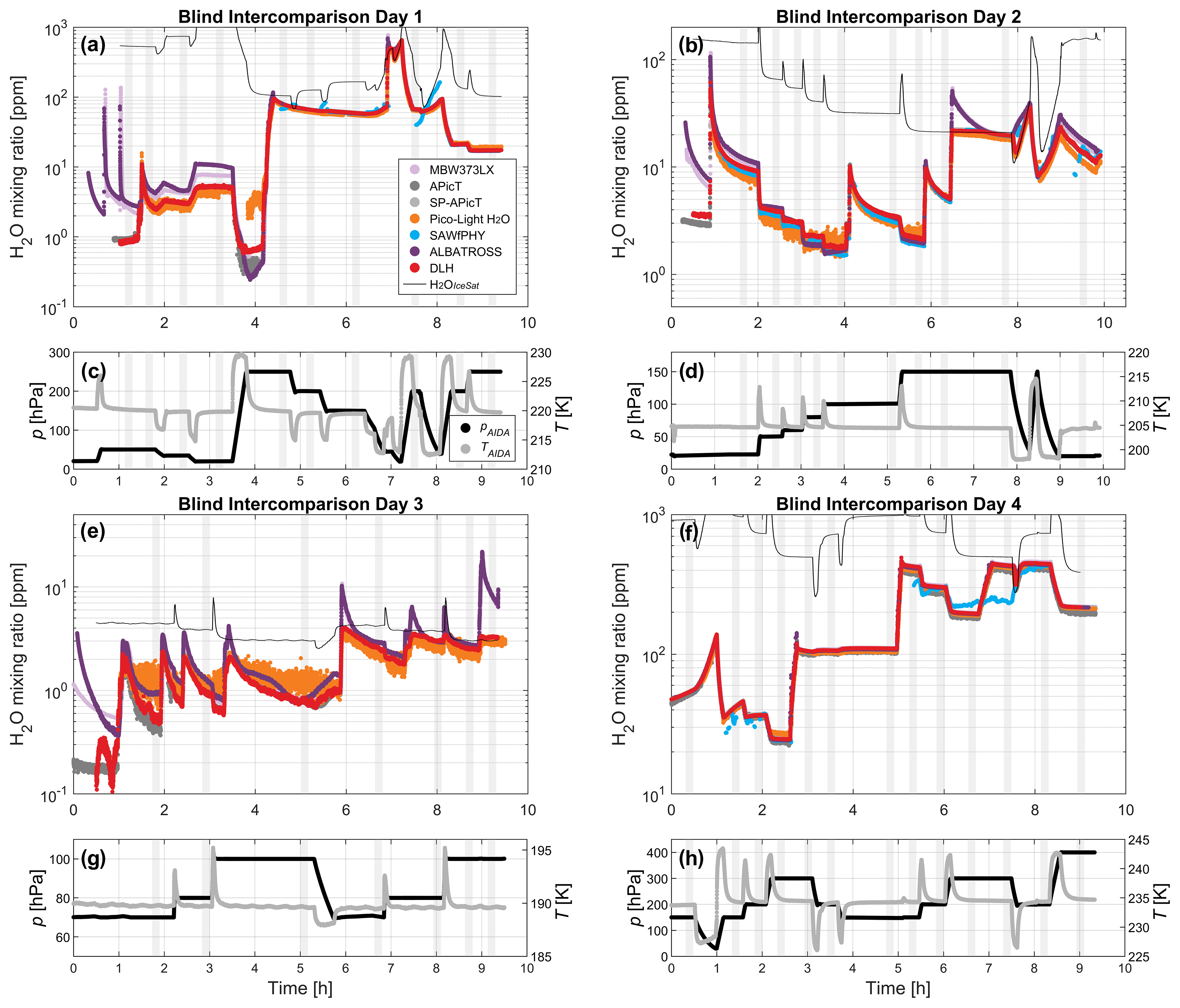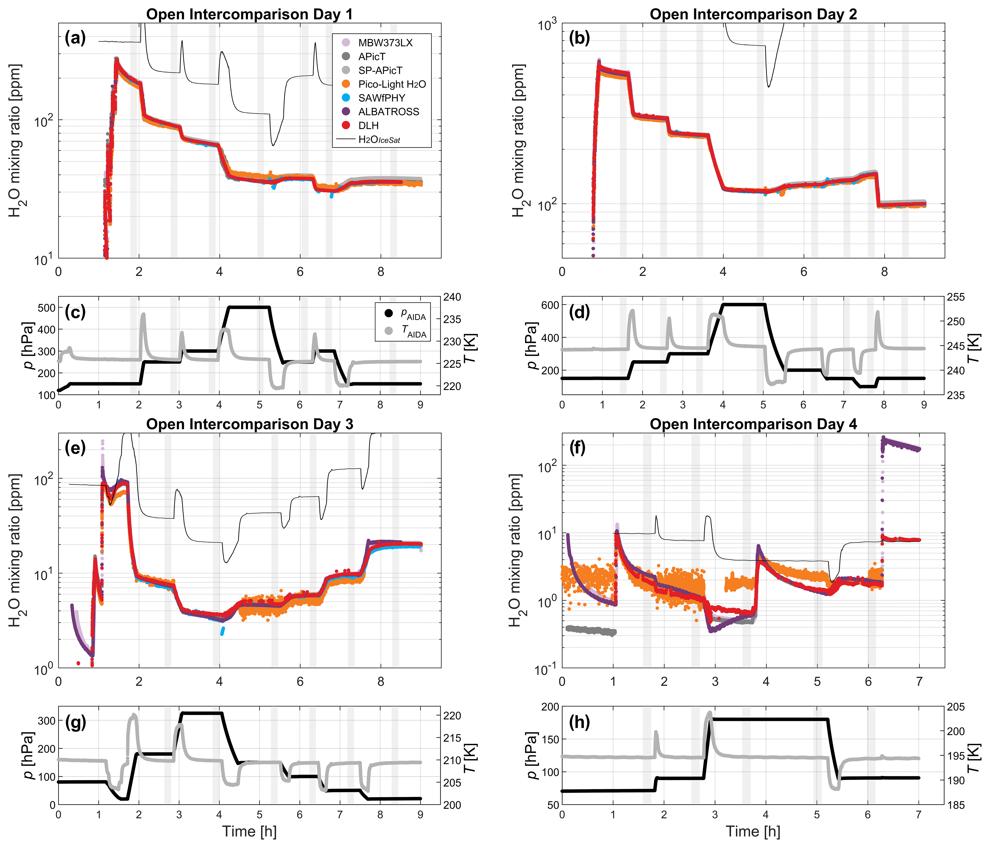 Figure 3Time series of H2O mixing ratio measured by all instruments (a–b, e–f), namely MBW373LX (pink), APicT (dark gray), SP-APicT (light gray), Pico-Light (orange), SAWfPHY (blue), ALBATROSS (purple), and DLH (red), along with AIDA chamber pressure (pAIDA) and temperature (TAIDA) (c–d, g–h) for each day of the open intercomparison phase of the campaign. All data shown here are averaged to a uniform integration time of 2 s. The static intervals selected for the statistical comparison (i.e., set points) are identified by the gray shaded intervals (duration 10 min each). Note that, for consistency, the color coding applied here to the different instruments is used consistently in all the following figures. The initial phases, especially of the experiments with lower water mixing ratios, were intended to give the sampling lines time to dry. The solid black line in (a)–(b) and (e)–(f) shows the ice-saturated H2O mixing ratio (H2OIceSat) calculated from pAIDA and TAIDA (see Sect. 5.3).