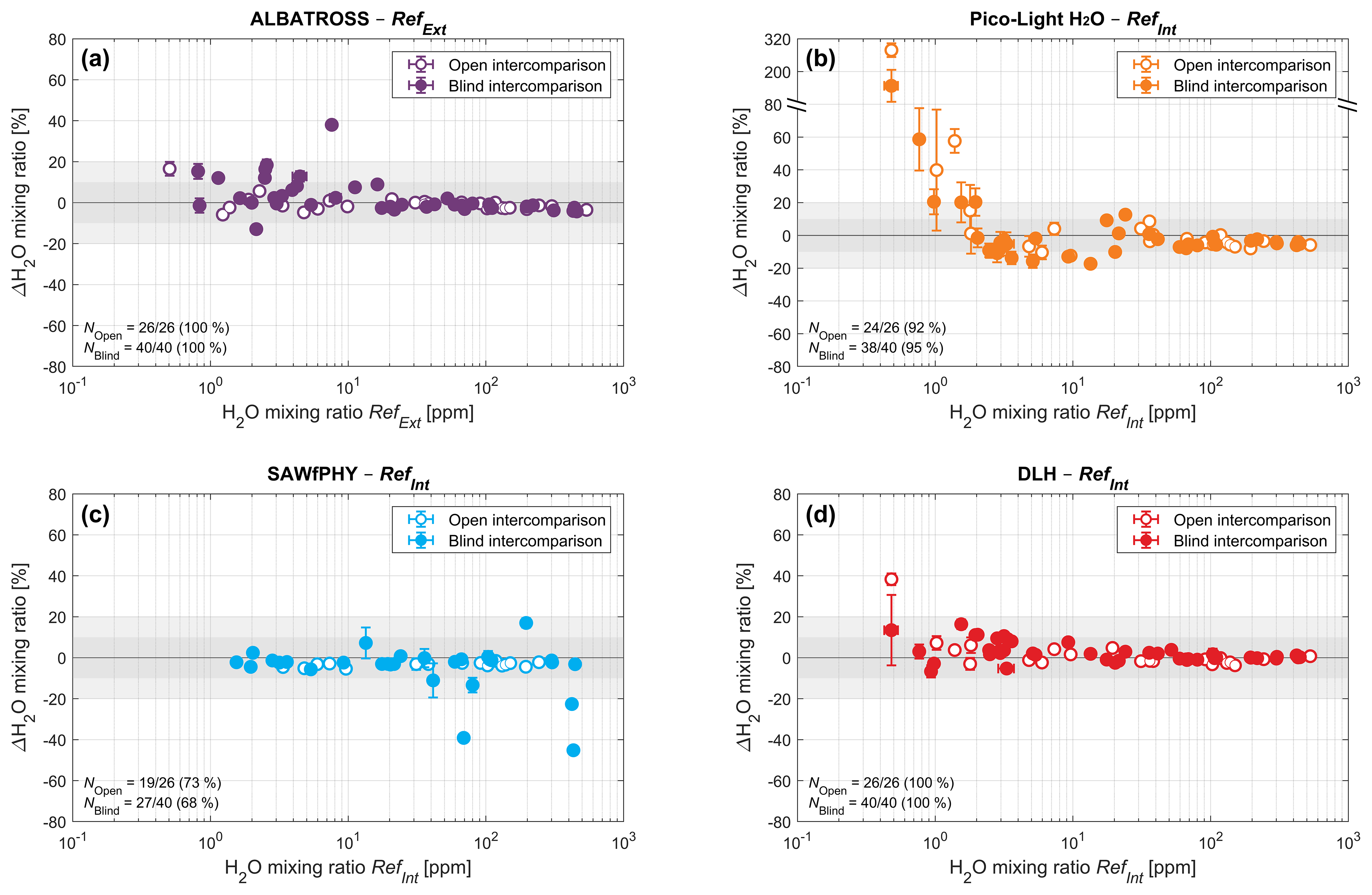 Figure 6Scatter plots of the mean relative difference (ΔH2O) of each instrument with respect to its reference dataset, namely ALBATROSS – RefExt (a), Pico-Light – RefInt (b), SAWfPHY – RefInt (b), and DLH – RefInt (d), calculated for all set points of the open (open circles) and blind (filled circles) intercomparison. Vertical error bars show the standard deviation range of the difference within each set point, while horizontal error bars show the standard deviation range of the reference H2O mixing ratio.