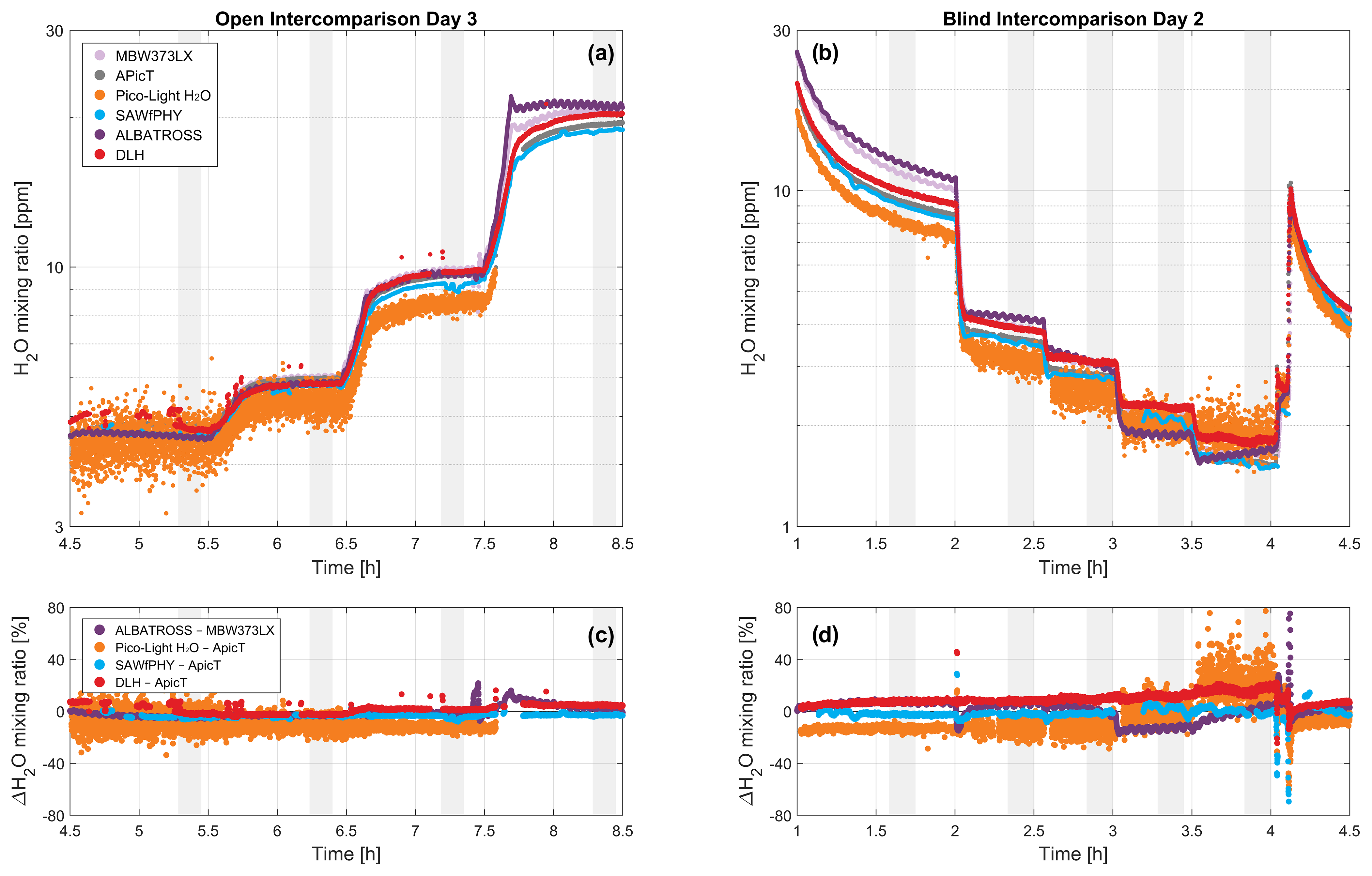 Three main effects influence the behavior of the reference instruments: (i) slower time response due to required drying of the sampling tube (surface effects), leading to a systematic high bias of the extractive measurements with respect to the internal ones (Fig. 5a–b); (ii) longer times required to build up a detectable frost layer on the MBW373LX mirror at low H2O mixing ratios; and (iii) additional internal water absorption affecting the retrievals of the short-path SP-APicT, caused by water vapor in the sealed laser compartment, leading to a systematic moist bias of SP-APicT with respect to APicT at low H2O mixing ratios (Fig. 5c, gray dots).