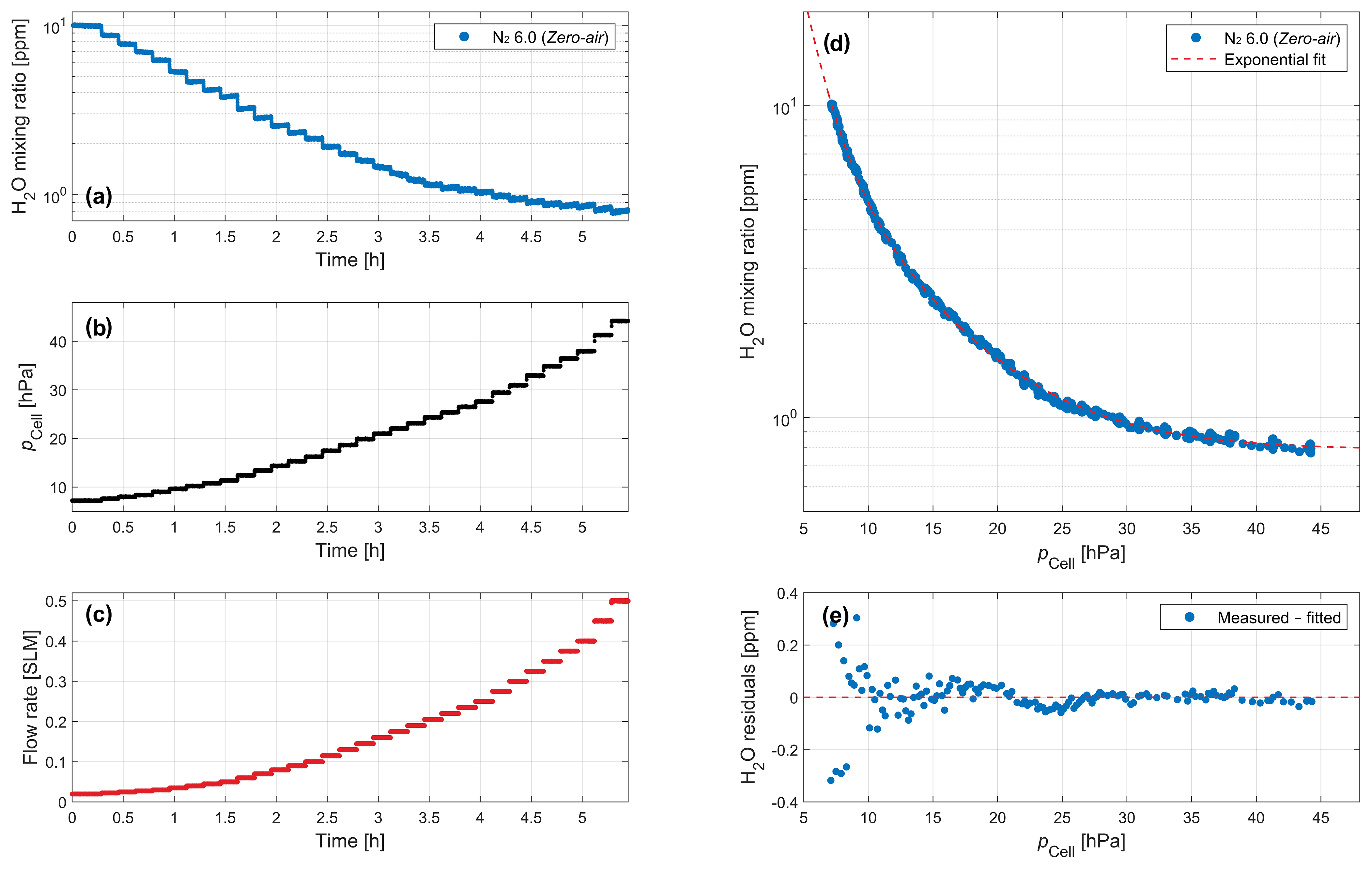 Figure 5a shows that larger differences between extractive and in situ measurements tend to be associated with lower pressures in the AIDA chamber (see range of 5–10 ppm H2O), which is consistent with the pressure-dependent desorption of H2O molecules in the sampling line (i). However, no direct correlation can be inferred due to the involved memory effects. The slow response time of MBW373LX due to the build-up of the frost layer (ii) is compensated for by selecting static intervals with nearly constant H2O mixing ratios.