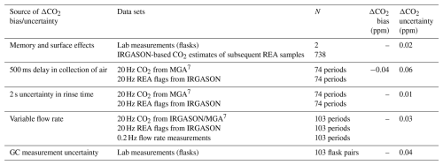 Table 3Overview of the estimated biases and uncertainties in the CO2 concentration differences between updraft and downdraft flasks (ΔCO2) due to non-idealities in the sampling procedure. Given are the means (bias) and standard deviations (uncertainty) of the measured or simulated changes in ΔCO2 with respect to the expected values. For completeness, the measurement uncertainty of the gas chromatographic analysis of the flasks is also given. N represents the number of measurements or sampling periods for the underlying data set.