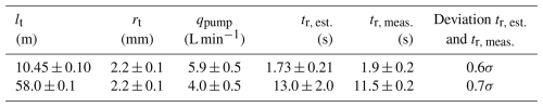 It was also shown that the time needed to pump an air parcel from the inlet into the buffer as estimated from the flow rates and the volumes of the tubes (Eq. 10) agrees well (within less than 1.5σ) with the measured travel time of an artificial CO2 pulse (see Appendix B3). This confirms the calculation of the rinse time according to Eq. (10).