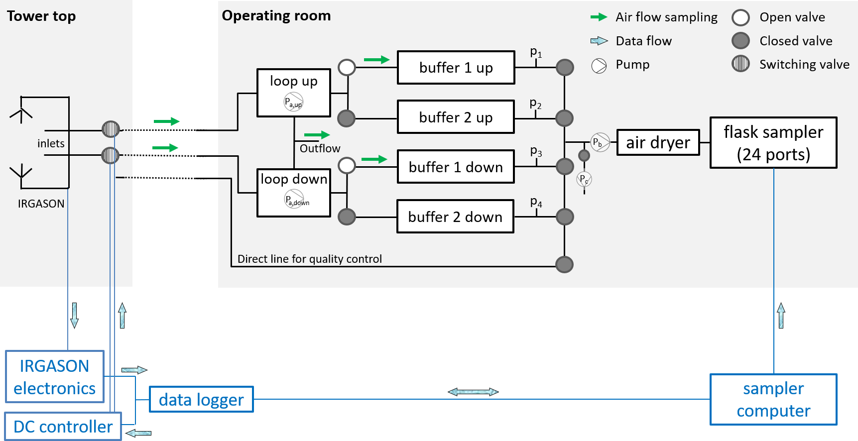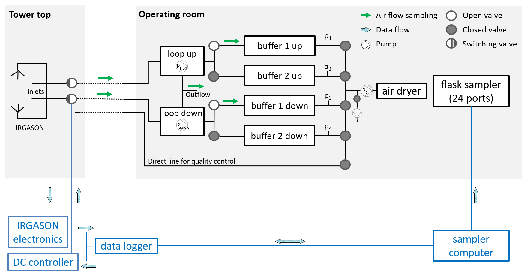 Figure 1Schematic setup of the REA flask sampling system. Pa–Pc refers to the pumps that transfer the air from the inlets to the flask sampler and evacuate the buffers after sample transfer. p1–p4 indicates pressure sensors. Blue components at the bottom of the diagram depict the general wiring for data transfer and communication between the data logger and the sampler computer. The green arrows and the filled, unfilled, and hatched circles indicate the air flow and the position of the valves when sampling for buffer set 1. Details of the loop systems are shown in Fig. 2.