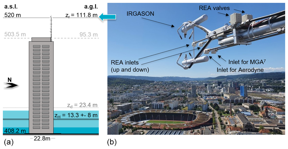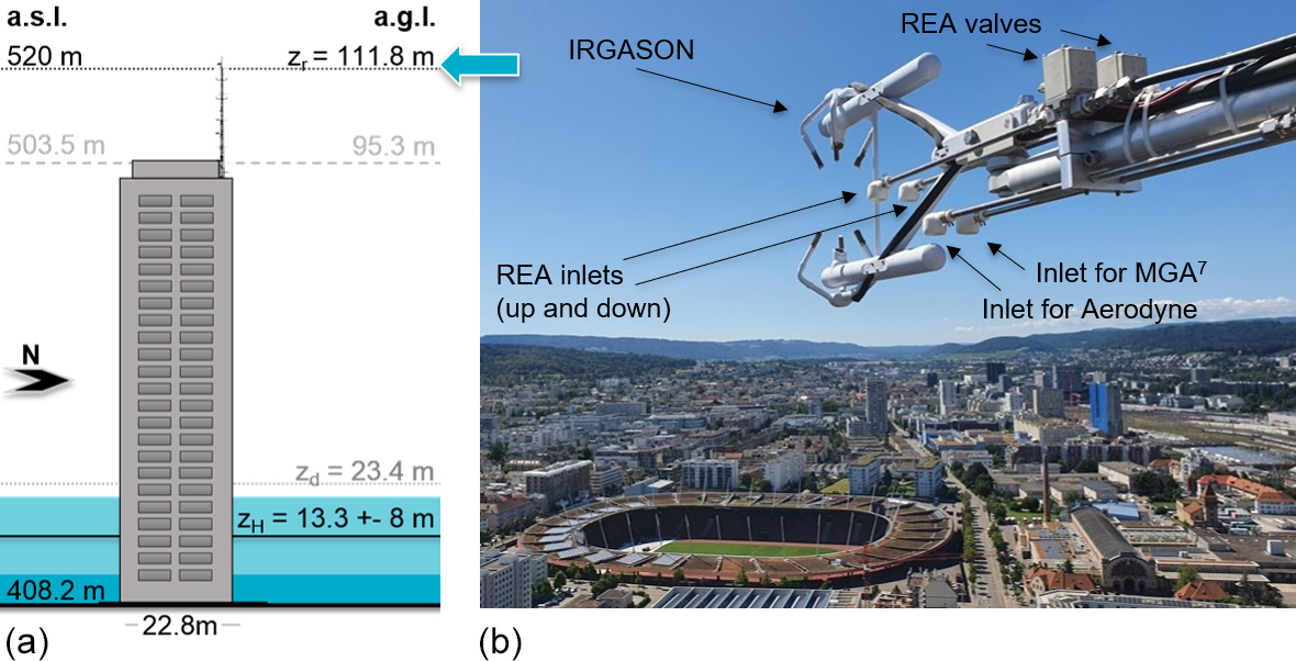 Figure 3Setup of the Zurich campaign. (a) Schematic illustration of the building Hardau II with the mast, where measurements were made. Also given are the corresponding heights in meters above sea level (m a.s.l.) and above ground level (m a.g.l.). zH denotes the mean building height within 1.5 km radius, and zd is the displacement height according to Kanda et al. (2013). (b) Picture of the IRGASON and the inlets for the relaxed eddy accumulation (REA) system, a multi-compound (MGA7) gas analyzer, and an Aerodyne for carbonyl sulfide (COS) measurements. The aforementioned instruments were placed in a room on the top floor of the building and connected by 33 m long Synflex tubings.