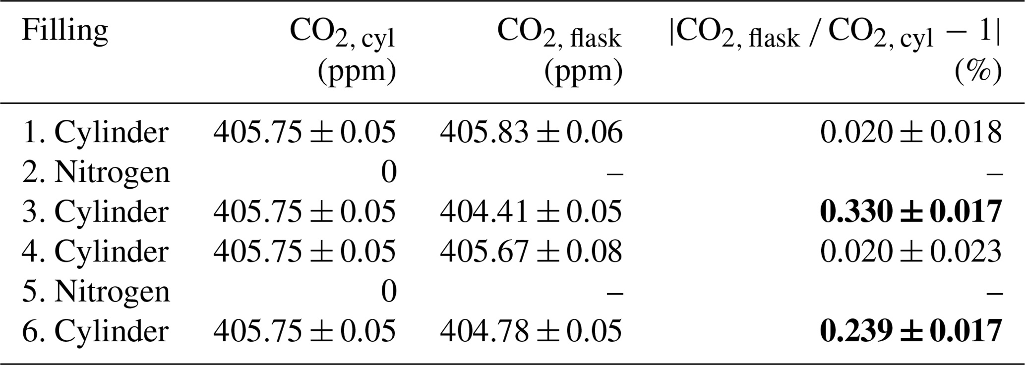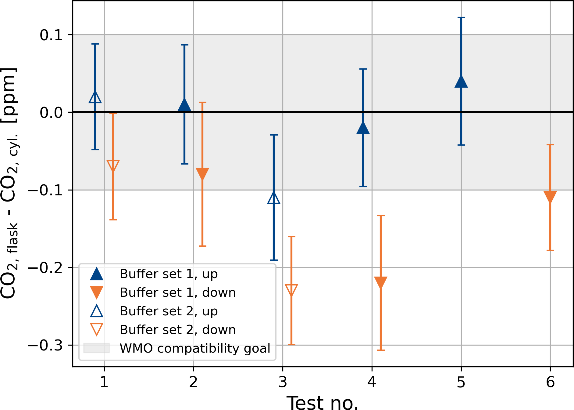 By sampling gas from a cylinder with a known concentration under sampling conditions as close to reality as possible (for details, see Appendix B), it was shown that neither the buffers nor the intake lines or the switching of the valves alter the gas concentrations significantly. As shown in Fig. 4, the CO2 concentrations of test flasks filled with the sampling system using updraft and downdraft intakes, the loop systems, and buffers agree within 1σ with each other and with the cylinder concentration and mostly meet the WMO compatibility goal for CO2 of 0.1 ppm (WMO recommendation for the compatibility of measurements of greenhouse gases and related tracers; Tans and Zellweger, 2014).