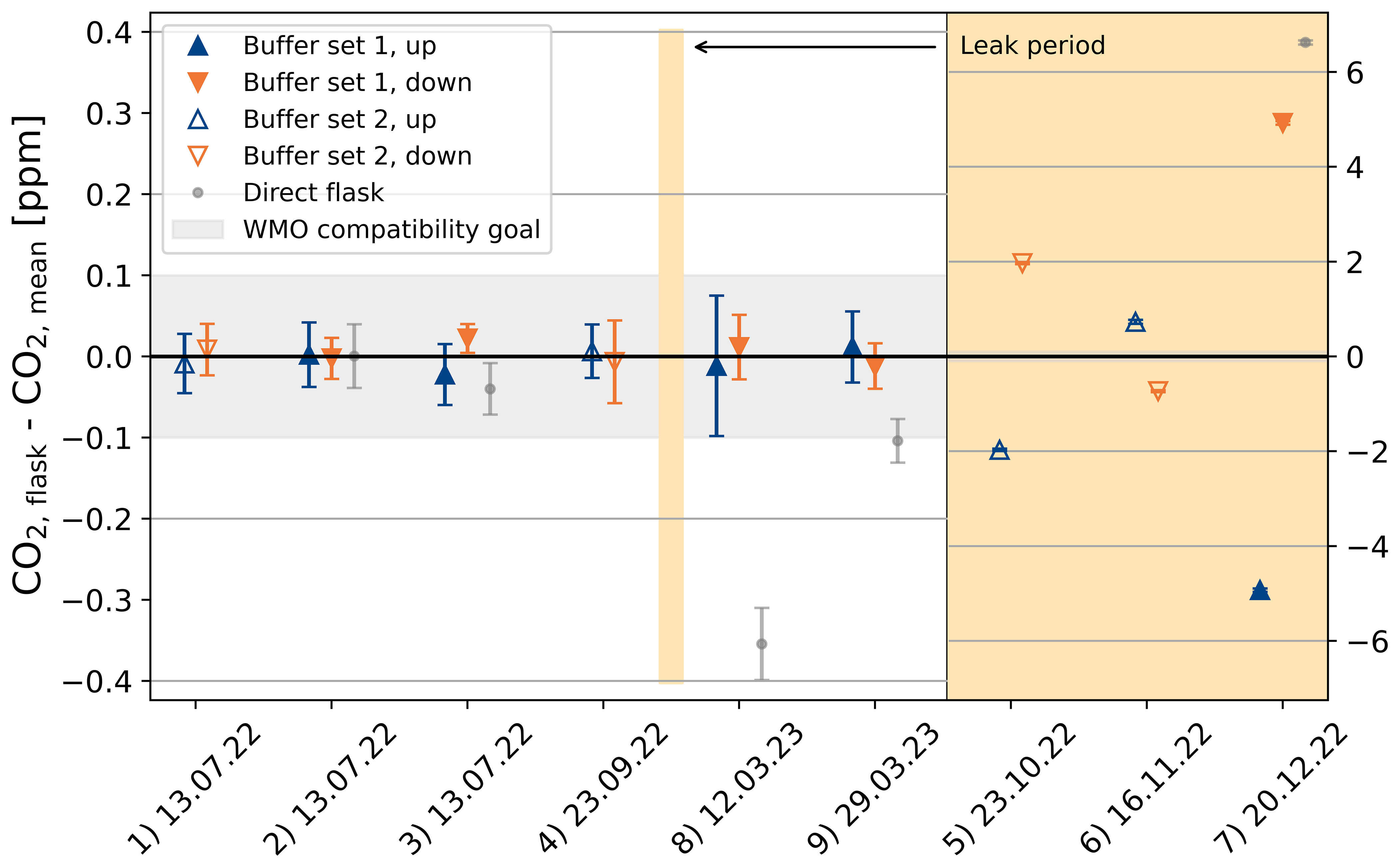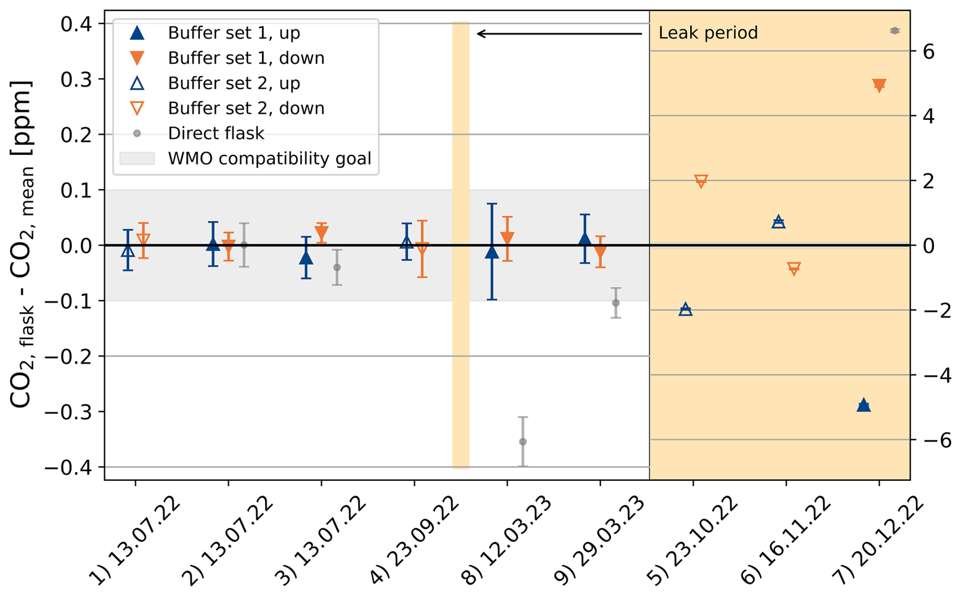 Figure 4Deviation of measured flask sample concentrations from the CO2 concentration of the reference cylinder (405.71 ± 0.01 ppm) that was connected to the fast-response solenoid valves. The gray-shaded area highlights the WMO compatibility goal of 0.1 ppm for CO2. Details of the experiments are given in Appendix B.