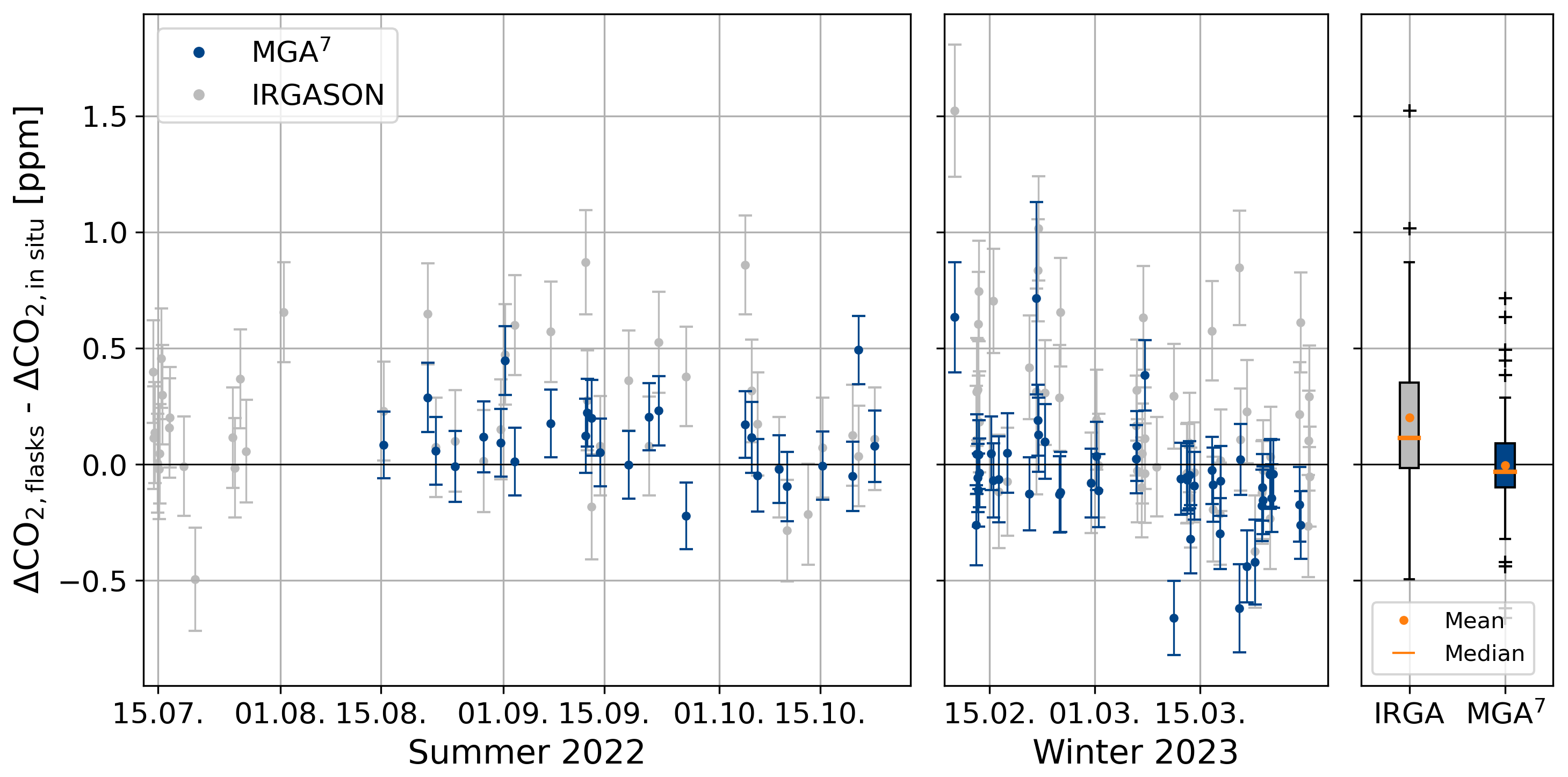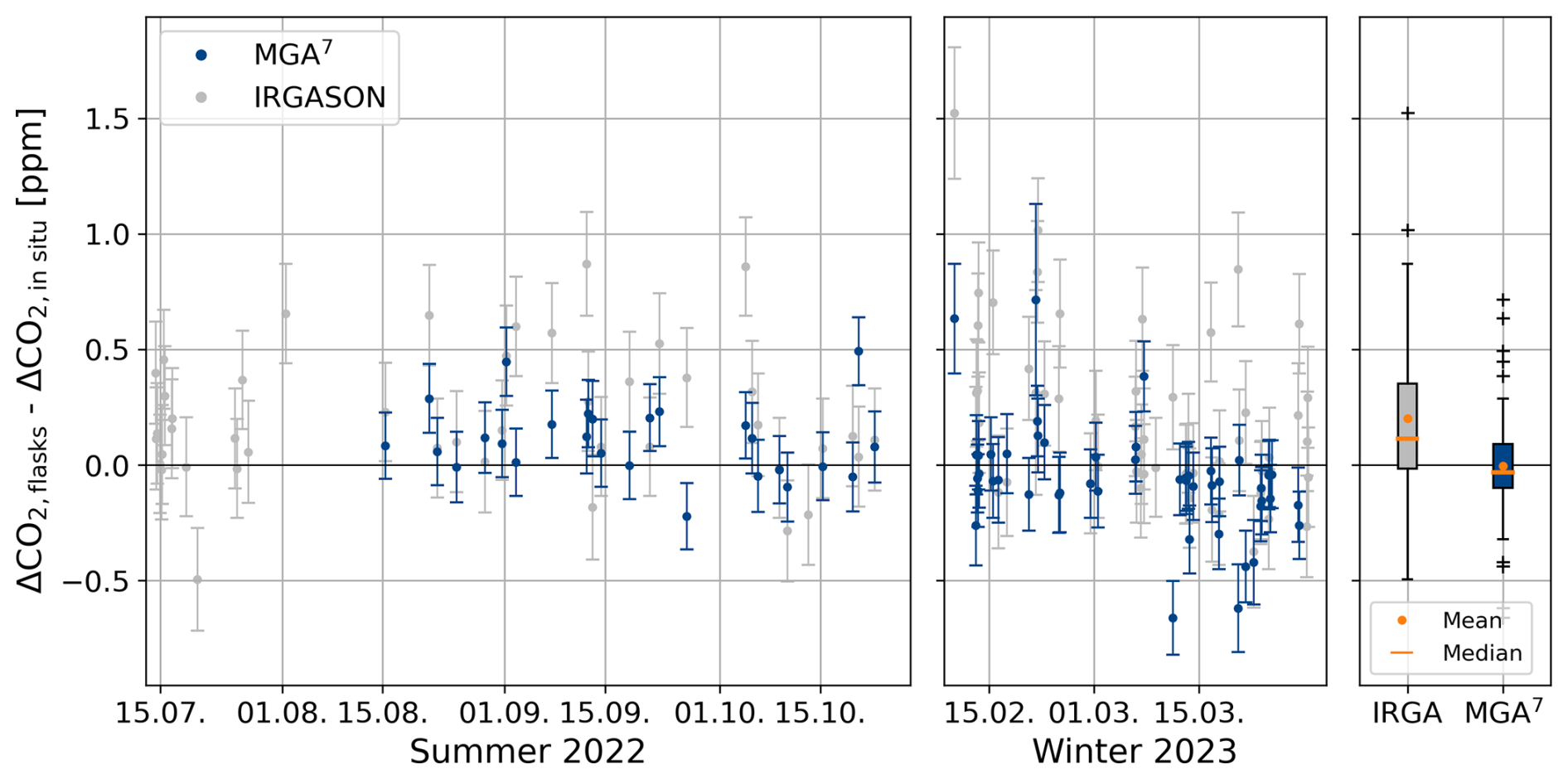 To ensure that the REA flask sampling system was working as intended, quality control tests were performed regularly throughout the Zurich campaign. In addition, the measured concentration differences of the REA flask pairs were compared with the in situ measurements of the IRGASON and the MGA7.