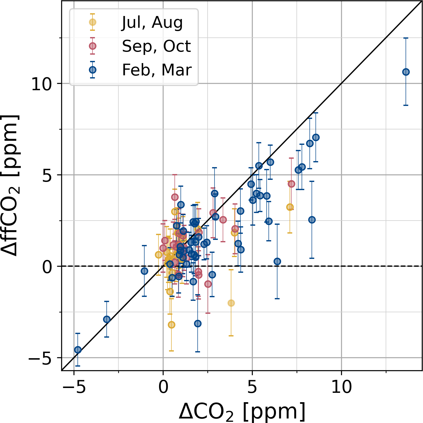 For all samples, higher and Δcnf lead to higher ΔffCO2 estimates. Consequently, with the assumptions of = 9 ± 16 ‰ and Δcnf = 5 ± 5 ppm, ΔffCO2 would be overestimated or underestimated if the actual values were smaller or larger. The magnitude of the effect depends on the difference and is therefore largest for winter samples.