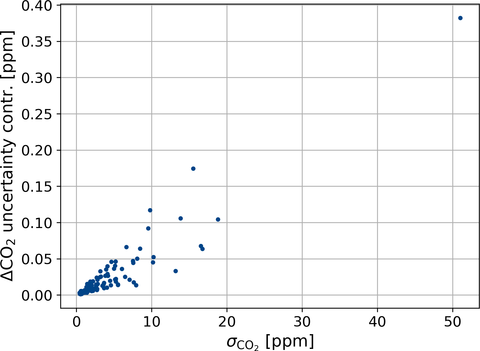 Under real sampling conditions, a certain variability of the flow rate and, thus, an inhomogeneous weighting of the concentration over time are to be expected, adding uncertainty into the ΔCO2 flask measurements. To estimate this uncertainty for each REA flask pair, the CO2 concentration differences between updraft and downdraft samples were simulated from the high-frequency CO2 measurements of the MGA7 or, if not available, the IRGASON (compare to Appendix C2) but this time with different weightings for each 20 Hz measurement. A total of 103 weighting functions were therefore calculated by interpolating the 103 flow rate time series (temporal resolution of 5 s) recorded by the two mass flow controllers in the loop systems during the Zurich REA runs in relation to the 20 Hz CO2 in situ measurements of each REA run. This resulted in 103 ΔCO2 estimates for each REA run. The standard deviations of these estimates were then considered to be the ΔCO2 uncertainty due to flow rate variability. The mean uncertainty of the 103 REA runs was 0.03 ± 0.05 ppm. As shown in Fig. C1, the magnitude depends on the CO2 variability of the ambient air. In the extreme case of a standard deviation of the ambient CO2 of more than 50 ppm, the estimated uncertainty can be as high as 0.38 ppm. On the other hand, if CO2 is approximately constant, the weighting does not matter. In the analysis of ΔCO2, e.g., in the comparison of flasks with in situ measurements (Sect. 5.3), it is therefore recommended to consider the uncertainty contributions for each REA sample individually. For the estimation of ΔffCO2, on the other hand, the uncertainty due to flow rate variability is still negligible compared to the 14C measurement uncertainty (Appendix D).