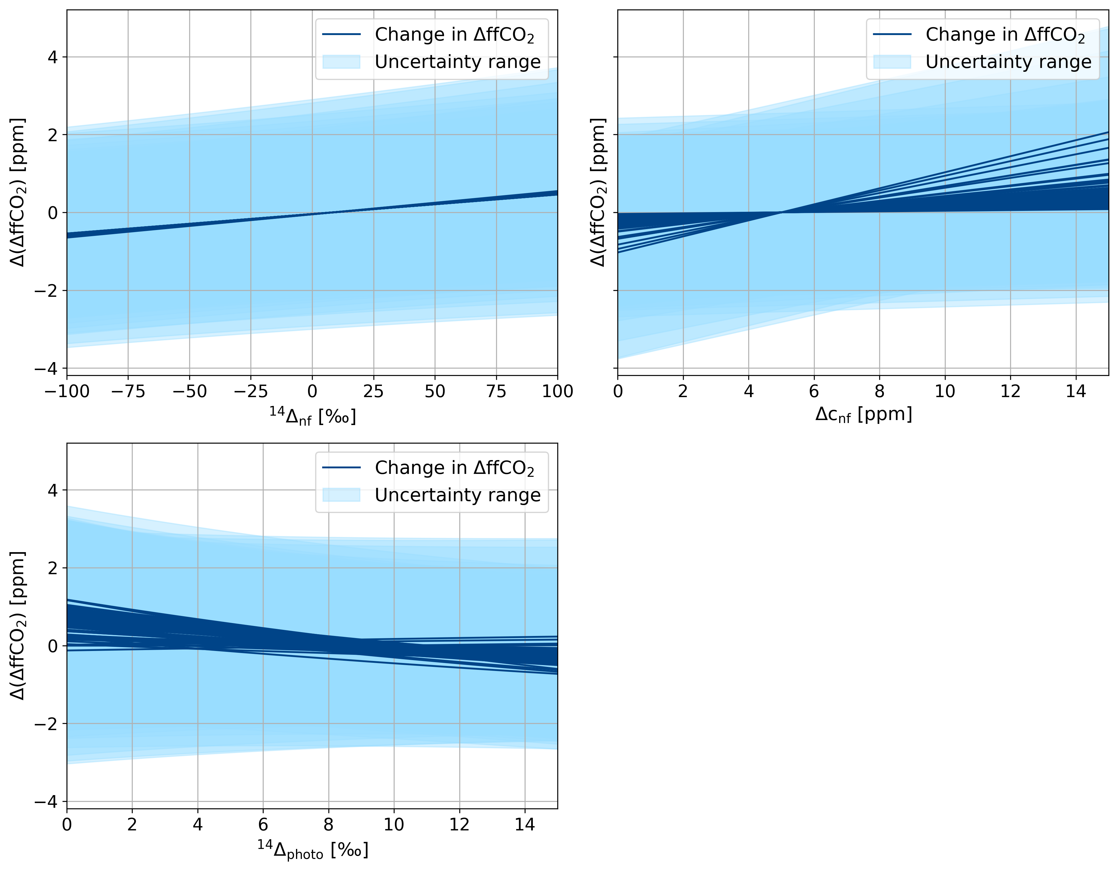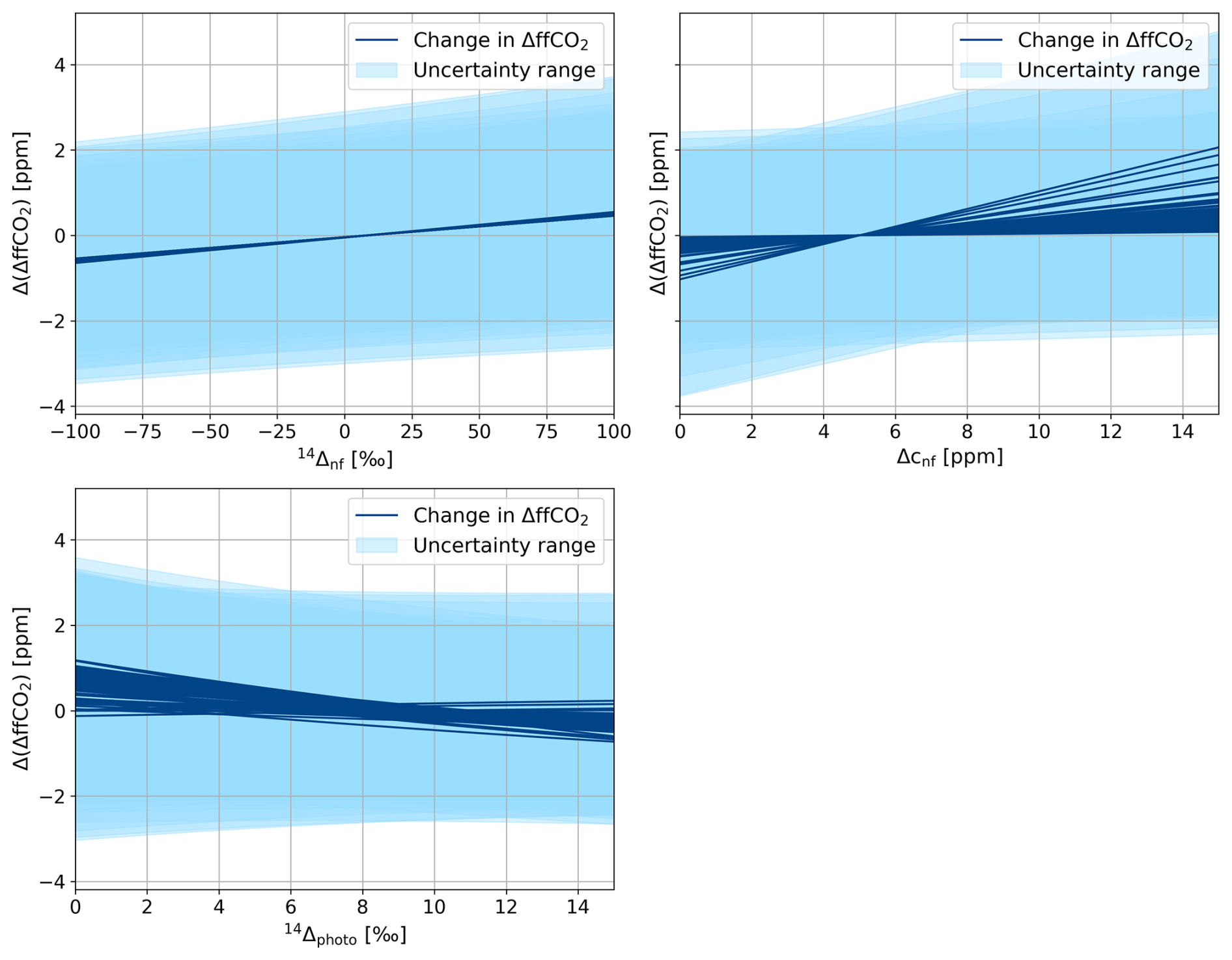Varying the variables over the entire reasonable range, the differences can be as large as 2 ppm and thus of the same order of magnitude as ΔffCO2 itself. Nevertheless, due to the large 14CO2 measurement uncertainty (compare to light-blue area in Fig. D1), the deviations from the previous ΔffCO2 estimates are not significant.