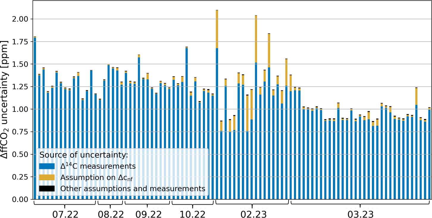 The fact that the uncertainty of ΔffCO2 estimates is dominated by the 14CO2 measurement uncertainty can also be seen in Fig. D2. It shows the contributions of each variable to the ΔffCO2 uncertainty in ppm for each REA sample pair. The contributions of the ΔCO2 uncertainty (including all aspects summarized in Table 3) and the assumptions regarding and are summarized as “other assumptions and measurements” (black) and are negligible for all samples. As discussed before, the impact of Δcnf (orange) is especially large for the winter samples but is still secondary compared to the Δ14 measurement uncertainty (blue). The latter has been reduced from approximately 1.3 to 1.0 ppm as the graphite targets were measured with a new accelerator mass spectrometer starting January 2023. This improved the mean Δ14 precision from 2.1 ± 0.3 ‰ to 1.6 ± 0.2 ‰. Overall, the analyses show that the choice of , , and Δcnf has little effect on the ΔffCO2 estimate due to the current Δ14 measurement precision.