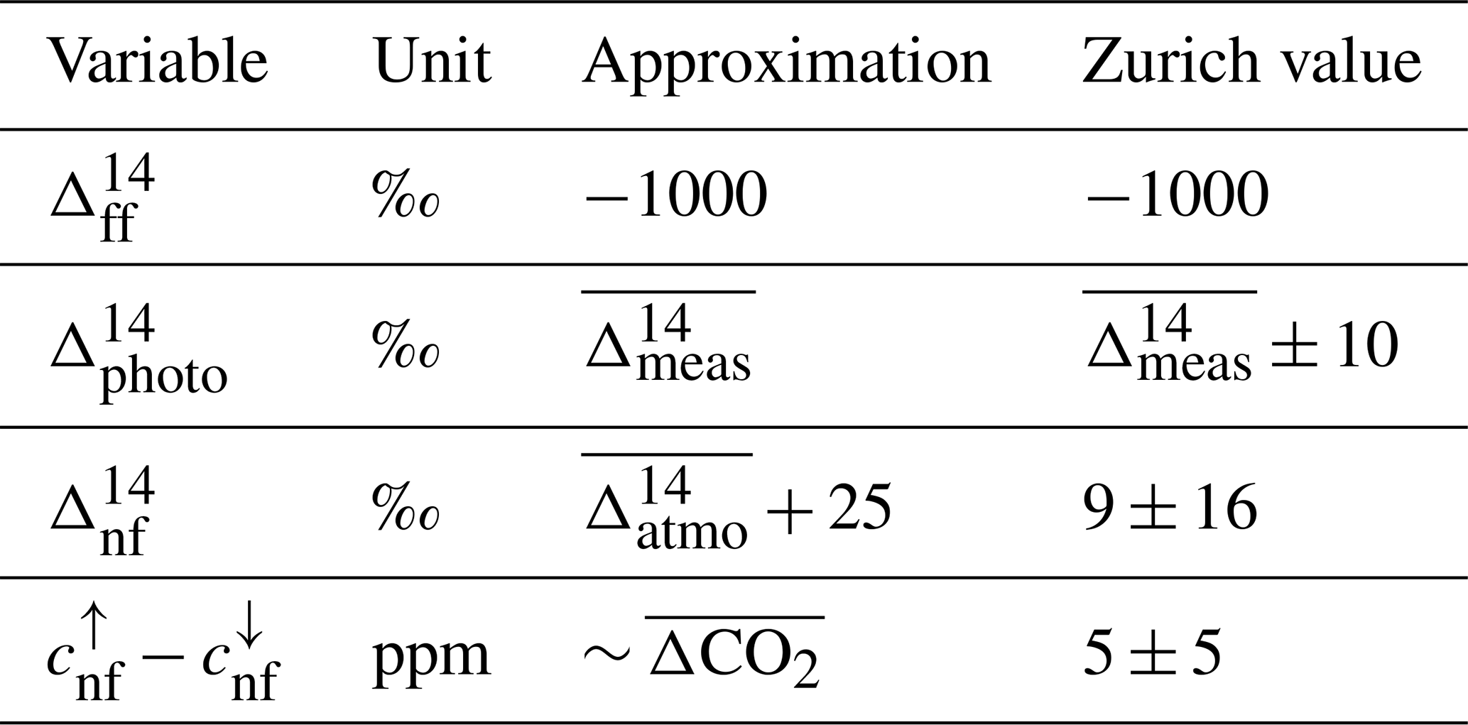 Since fossil fuel emissions do not contain any 14C, is, by definition, exactly −1000 ‰. On the contrary, biogenic signatures are heterogeneous and much more uncertain (e.g., Naegler and Levin, 2009b; Maier et al., 2023). To estimate (in the following denoted as ΔffCO2), it is therefore necessary to make assumptions about , and .