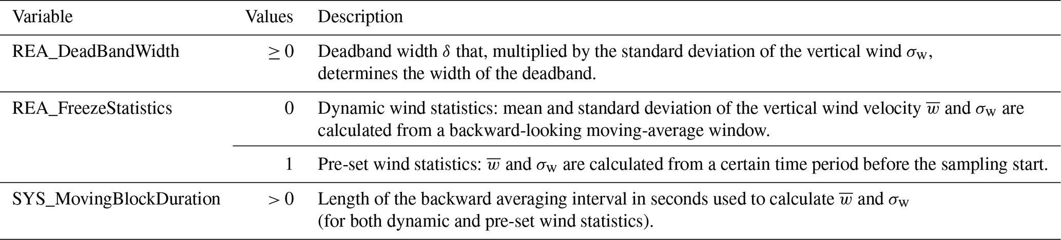 During an REA run, the data logger controls the opening and closing of the solenoid valves at the inlets according to the in situ measurements of the vertical wind velocity. Depending on the definition of the deadband (Sect. 2), flags are assigned to each 20 Hz wind measurement, denoting the status of the two valves in the current and previous time step. If the two values are different, the corresponding valve is switched. For quality control, the flags, called REA flags in the following, can be used to estimate the sample CO2 concentrations from high-frequency in situ concentration measurements (see Sect. 5.2 and 5.3.2).