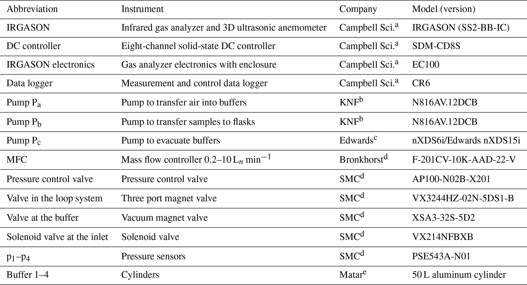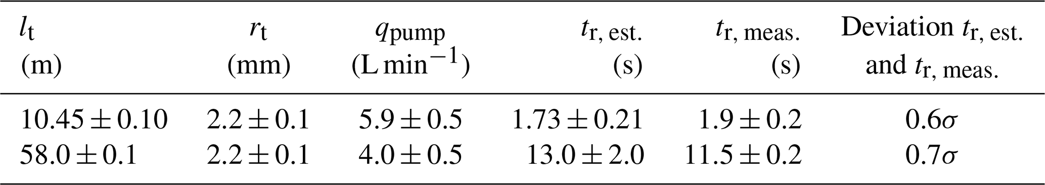 It was also shown that the time needed to pump an air parcel from the inlet into the buffer as estimated from the flow rates and the volumes of the tubes (Eq. 10) agrees well (within less than 1.5σ) with the measured travel time of an artificial CO2 pulse (see Appendix B3). This confirms the calculation of the rinse time according to Eq. (10).