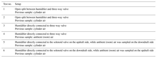 Table 3Overview of the estimated biases and uncertainties in the CO2 concentration differences between updraft and downdraft flasks (ΔCO2) due to non-idealities in the sampling procedure. Given are the means (bias) and standard deviations (uncertainty) of the measured or simulated changes in ΔCO2 with respect to the expected values. For completeness, the measurement uncertainty of the gas chromatographic analysis of the flasks is also given. N represents the number of measurements or sampling periods for the underlying data set.