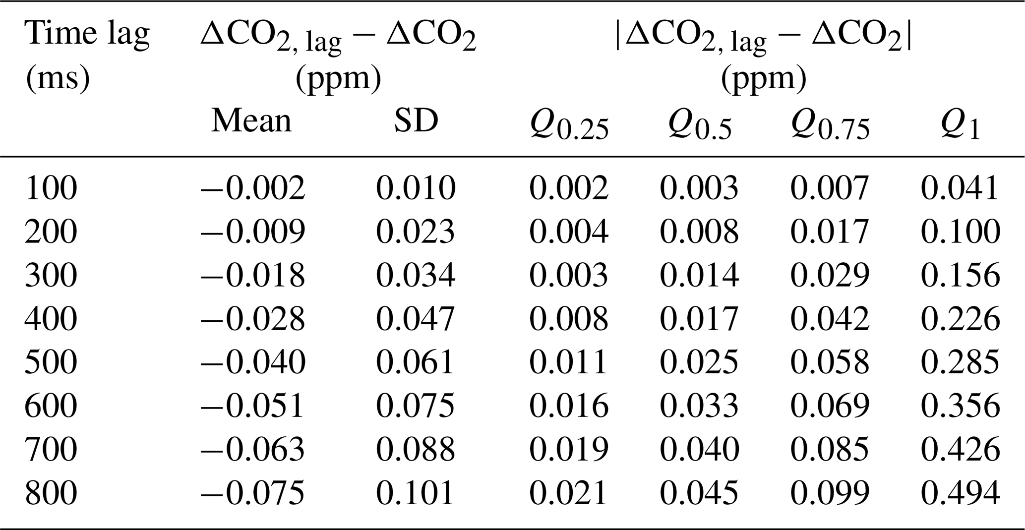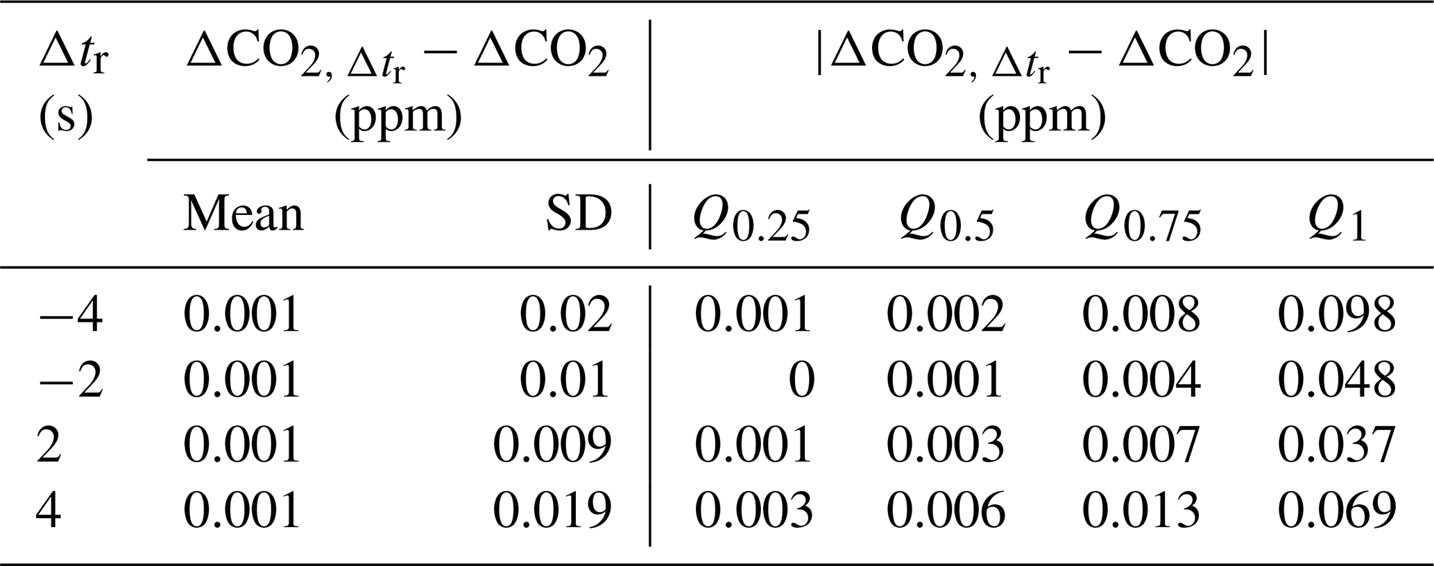 Table C3ΔCO2 simulated from MGA7 in situ measurements assuming different errors Δtr in the rinse time. Positive or negative Δtr indicate whether the rinse time was overestimated or underestimated. Given are the mean and standard deviation (SD), as well as the 0.25th, 0.5th, 0.75th, and 1st quantiles of the differences in relation to the ideal case without Δtr = 0 for the Zurich REA runs (n = 74).