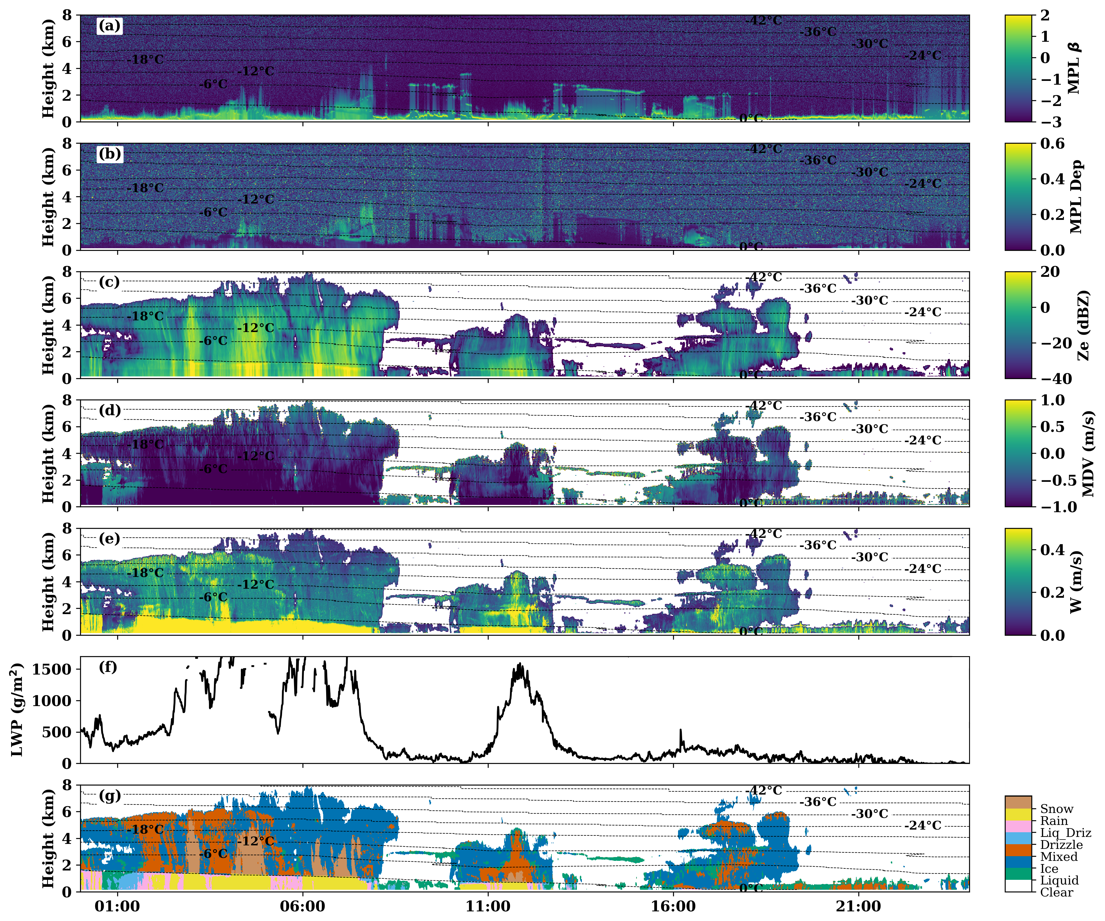 An example of multi-sensor remote sensing measurements and thermodynamic cloud-phase classification from the THERMOCLDPHASE VAP on 15 August 2021 at the ARM NSA observatory is shown in Fig. 1. The day started with a deep precipitating system with some embedded convection before 09:00 UTC, with cloud tops reaching up to 8 km and temperatures near the cloud top close to −40 °C. KAZR radar signals can penetrate through the cloud and provide measurements of the cloud structure. Increased radar reflectivity (Ze), downward motion (indicated by negative mean Doppler velocity, MDV), and Doppler spectral width (W) around 1 km suggest a transition from cold to warm precipitation (Fig. 1c, d, and e). Furthermore, the radar bright band is observable at ∼ 1 km when large falling ice crystals start to become coated with melted liquid water (Fig. 1c). Lidar signals, however, were quickly attenuated by warm raindrops near the surface, as shown in Fig. 1a and b. The large liquid water path (LWP) retrieved from the microwave radiometer and warm temperatures near the surface provide support for this identification (Fig. 1f and g). As shown in Fig. 1g, the THERMOCLDPHASE VAP identifies ice and mixed-phase regions in the middle and upper portions of the cloud system, with snow pixels occasionally present in the middle layers. Below approximately 1 km, warm cloud phases and precipitation, including liquid, drizzle, and rain, are observed. Two additional, relatively shallower cloud systems with similar cloud-phase structures were observed between 10:00 and 13:00 and 15:00 and 19:00 UTC. Interestingly, two mid-level thin liquid-layer clouds were observed after each of the first two systems. However, due to warmer cloud top temperatures, a lack of ice-nucleating particles (INPs), or other processes, these liquid cloud layers did not produce ice or produced ice that was immediately sublimated right below the cloud base. Further cloud model simulations could provide insights into these processes (Solomon et al., 2018, 2011). After 18:00 UTC, a typical polar low-level stratocumulus cloud with liquid droplets at the top and mixed-phase pixels below is observed. Note that the low radar reflectivity that appears to be detached from the cloud below between 20:00 and 22:00 UTC could be artifacts caused by side-lobe impacts of the KAZR moderate sensitivity mode (MD) (Silber et al., 2018). Accurately detecting and removing these radar artifacts are being investigated by the ARM radar data team (Ya-Chein Feng, personal communication, January 2025).