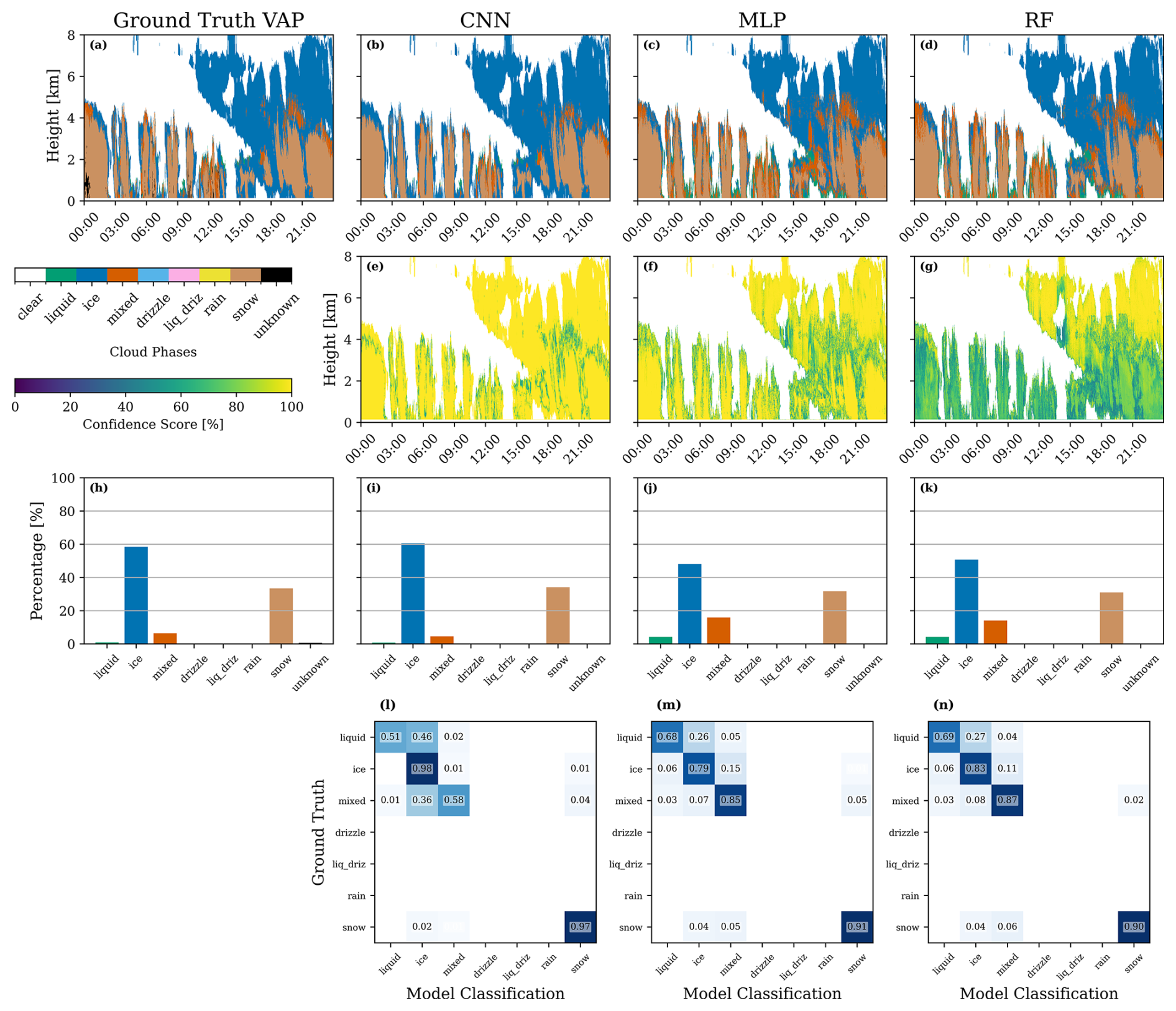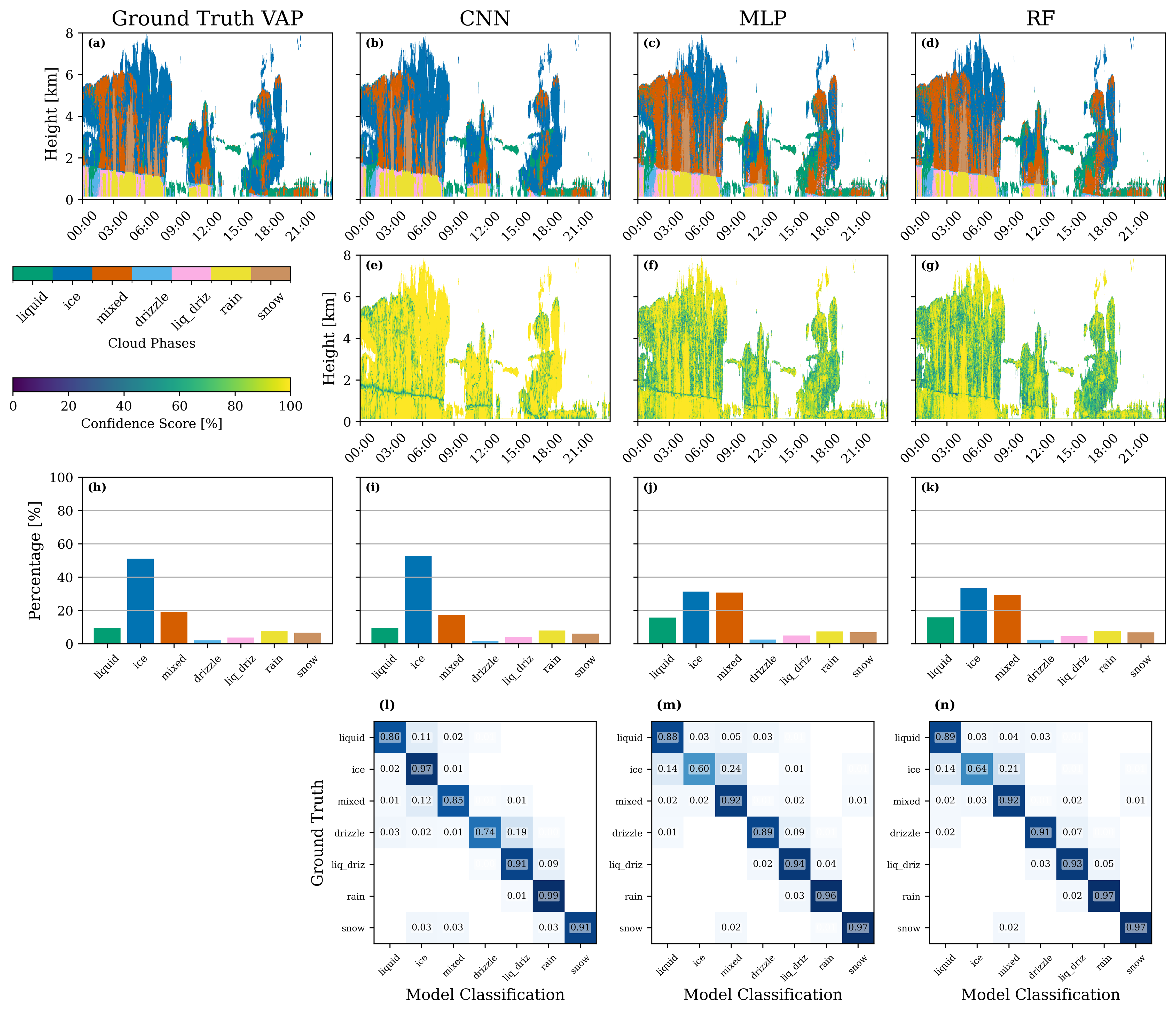 Both the CNN and the MLP have high confidence scores that are generally greater than 90 % for ice and snow pixels but significantly lower confidence scores for liquid- and mixed-phase pixels. Indeed, it is challenging to reliably distinguish liquid- and mixed-phase pixels from ice-phase pixels when they are embedded in ice-dominated clouds (Shupe, 2007; Silber et al., 2021). The lower model performance at ANX compared to at NSA is likely due to the more complex convective cloud structures associated with cold-air outbreaks (CAOs) at ANX (Geerts et al., 2022). The RF has lower confidence scores, except for ice-phase pixels at high altitudes after 12:00 UTC. The histogram plots in Fig. 9i–k show that all three ML models produce histograms that closely match the VAP, with the MLP and RF models slightly over-predicting the liquid category and under-predicting the ice category. The confusion matrices in Fig. 9l–n confirm that all three ML models predict the dominant ice and snow phases reasonably well, with accuracies exceeding 0.85. The three models all showed lower accuracy for the liquid phase (< 0.7), which is a minority category in this sample. In addition, both the MLP and the RF showed good predictions of the mixed-phase pixels, while the CNN showed a much lower accuracy in predicting mixed-phase pixels for this day. Overall, the CNN outperformed the MLP and RF models in terms of accuracy when predicting the dominant categories but performed worse than the other two models when predicting the minority categories.
