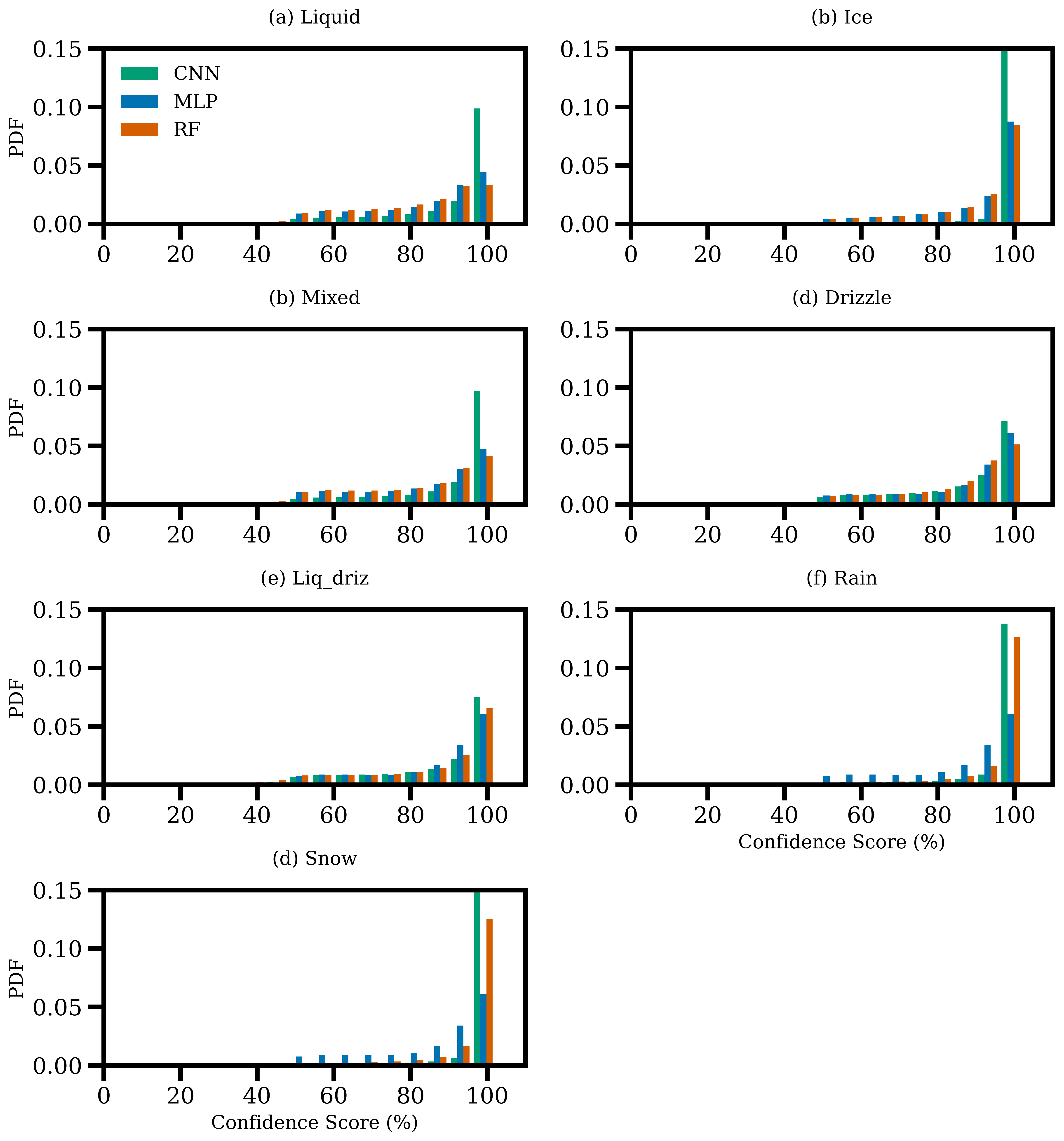 Given that the confidence score reflects the uncertainty of ML predictions, it is essential to analyze confidence scores and their relationship to accuracy for different thermodynamic cloud phases. Figure 4 presents a comprehensive statistical analysis of ML model confidence scores based on 1 year of data from 2021 at the NSA site. Overall, the confidence scores for thermodynamic cloud-phase predictions peak near 100 %, which is promising. Among the phases, predictions for ice, rain, and snow generally exhibit higher confidence scores across all three ML models. The ice phase, in particular, is reliably predicted – especially by the CNN model – due to the availability of key information such as the lidar backscatter and depolarization ratio, radar reflectivity, mean Doppler velocity and spectral width, and temperature (Shupe, 2007). The rain and snow phases, representing large particles in warm and cold conditions, respectively, can be identified using key information such as radar reflectivity, mean Doppler velocity, and temperature. In contrast, the confidence scores for the liquid-phase predictions are lower than those for the ice, rain, and snow phases. While the liquid phase can theoretically be reliably determined using lidar backscatter and depolarization ratio measurements, lidar signals are often quickly attenuated by low-level clouds, as illustrated in Fig. 1a and b. Under such conditions, identifying liquid-phase pixels becomes challenging when relying solely on radar reflectivity and spectral width data (Silber et al., 2020). The mixed, drizzle, and liq_driz phases have even lower confidence scores, likely due to the inherent difficulties in extracting their distinguishing characteristics from available measurements. Among the three ML models, the CNN achieves the highest confidence scores across all thermodynamic cloud phases. The MLP model exhibits confidence scores comparable to those of the RF model for the liquid, ice, mixed, drizzle, and liq_driz phases but shows significantly lower confidence scores for the rain and snow phases.