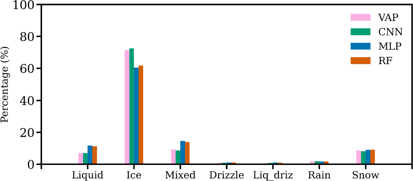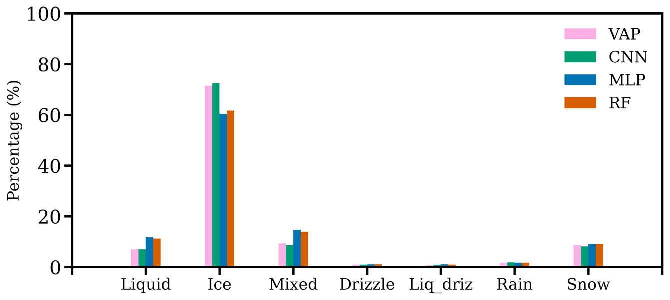 Figure 5 shows the frequency of thermodynamic cloud phases at the NSA site, as derived from the THERMOCLDPHASE VAP (labeled “VAP”), and predictions from the three ML models using 1 year of testing data. Due primarily to the low polar temperatures, the NSA site is primarily dominated by the ice phase, followed by mixed, snow, and liquid phases. Warm phases, including drizzle, liq_driz, and rain, occur much less frequently and are mostly confined to the summer season (Shupe, 2011). Comparing the ML predictions with the THERMOCLDPHASE VAP, the CNN closely matches the VAP's percentage distribution of thermodynamic cloud phases. In contrast, both the MLP and the RF models predict lower percentages for the ice phase but higher percentages for the liquid, mixed, drizzle, and liq_driz phases, consistent with the case observed in Fig. 3h–k.