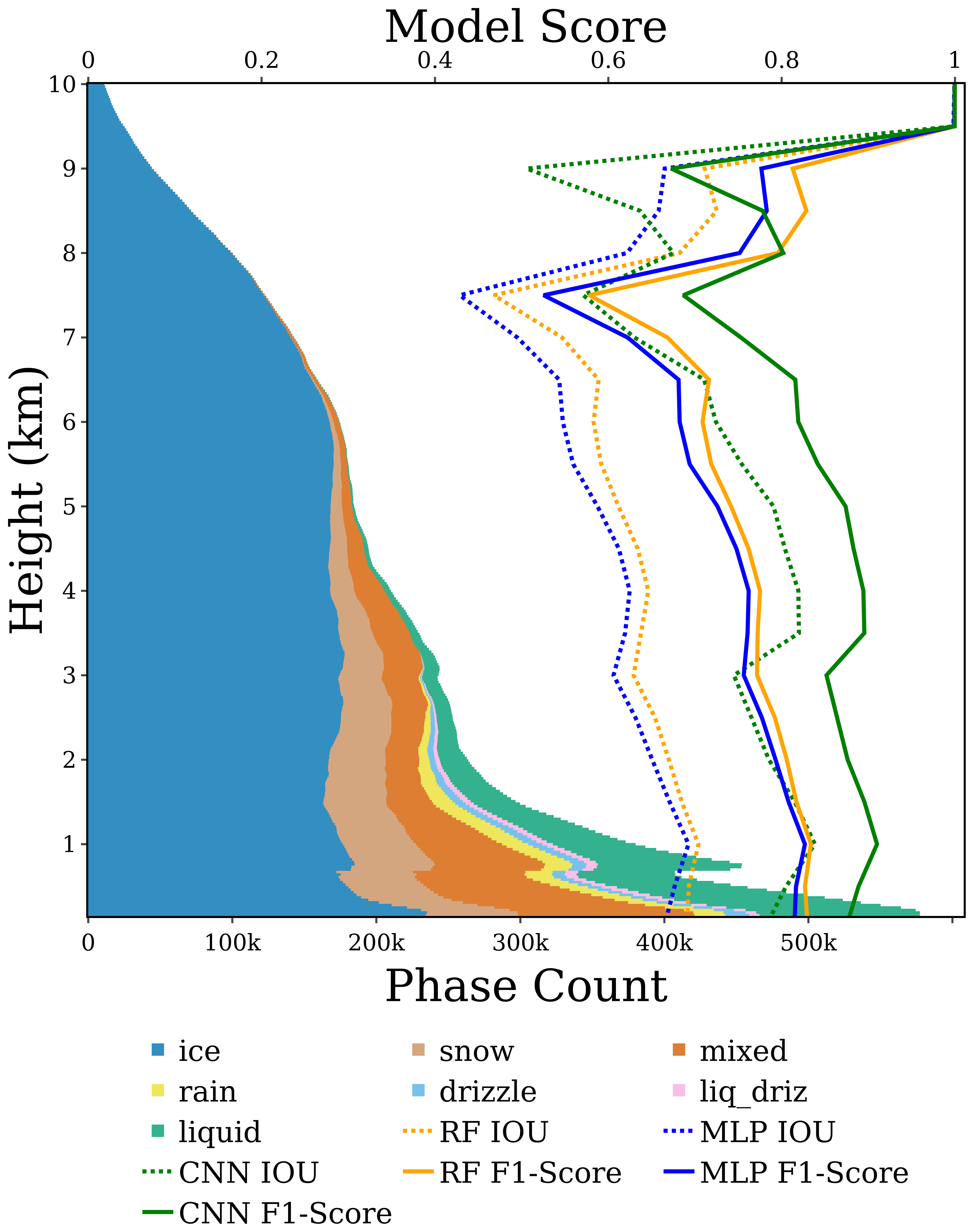 Figure 7Vertically resolved ML model F1 scores and mean IOU scores, overlaid on a stacked histogram of the frequency of the thermodynamic cloud-phase categories. A height bin size of 0.5 km is used to calculate the vertical profiles of mean IOU and F1 scores. Noise around 7.5–10 km is likely due to phase extinction and low pixel count.