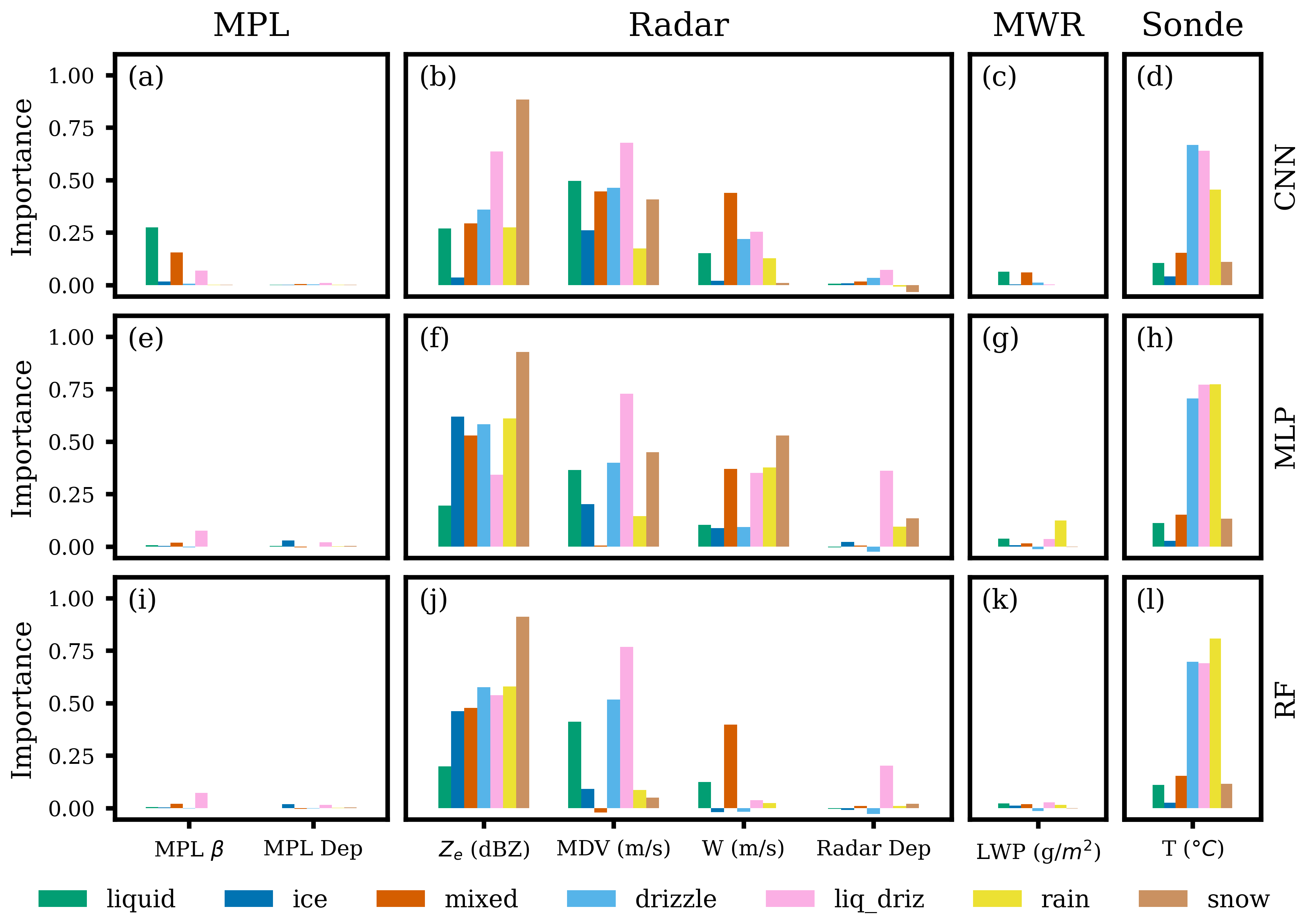 Figure 8Permutation feature importance of predicting thermodynamic cloud phases from (a–d) the CNN U-Net model, (e–h) the MLP model, and (i–l) the RF model. Features are grouped by the instruments they are derived from. The abbreviations are defined in Fig. 1. Radar dep represents radar linear depolarization.