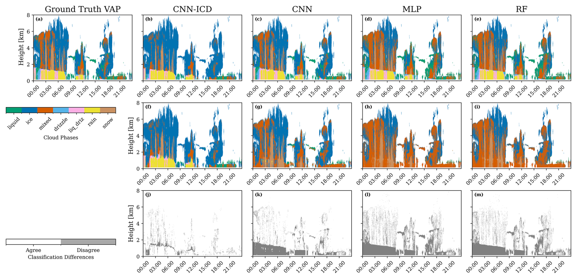 The different methods of training set construction and input format used by each of the models create different class imbalances and inherently complicate a direct comparison between models. For the RF and MLP models, an equal number of samples of each of the cloud-phase types was used to train and validate the models because they operate at a pixel level. Meanwhile, the CNN processes full time–height images, and its performance will be biased towards the most common pixel types (ice is the most common class observed at NSA). These challenges are inherent to the different ML models; for example, the RF cannot be trained on the huge dataset the CNN uses due to computational constraints. In the future, the CNN could potentially be trained with a class-weighted loss function to ensure that the model can identify the minority classes with greater accuracy, but class weighting does not have the exact same effect as rebalancing the class frequency, particularly when the class imbalance is large. Balancing the class distribution ensures that the model receives gradients of a similar scale from each class at approximately the same frequency throughout training. In contrast, altering the class weights results in predominantly small gradients from the majority classes, with occasional large gradients from minority classes. Therefore, achieving optimal performance is likely not as straightforward as selecting class weights that are inversely proportional to class frequency and will likely require fine-tuning of hyperparameters. Recent research has reported better results with combo loss (Taghanaki et al., 2019) rather than weighting schemes in similar applications (Xie et al., 2025).