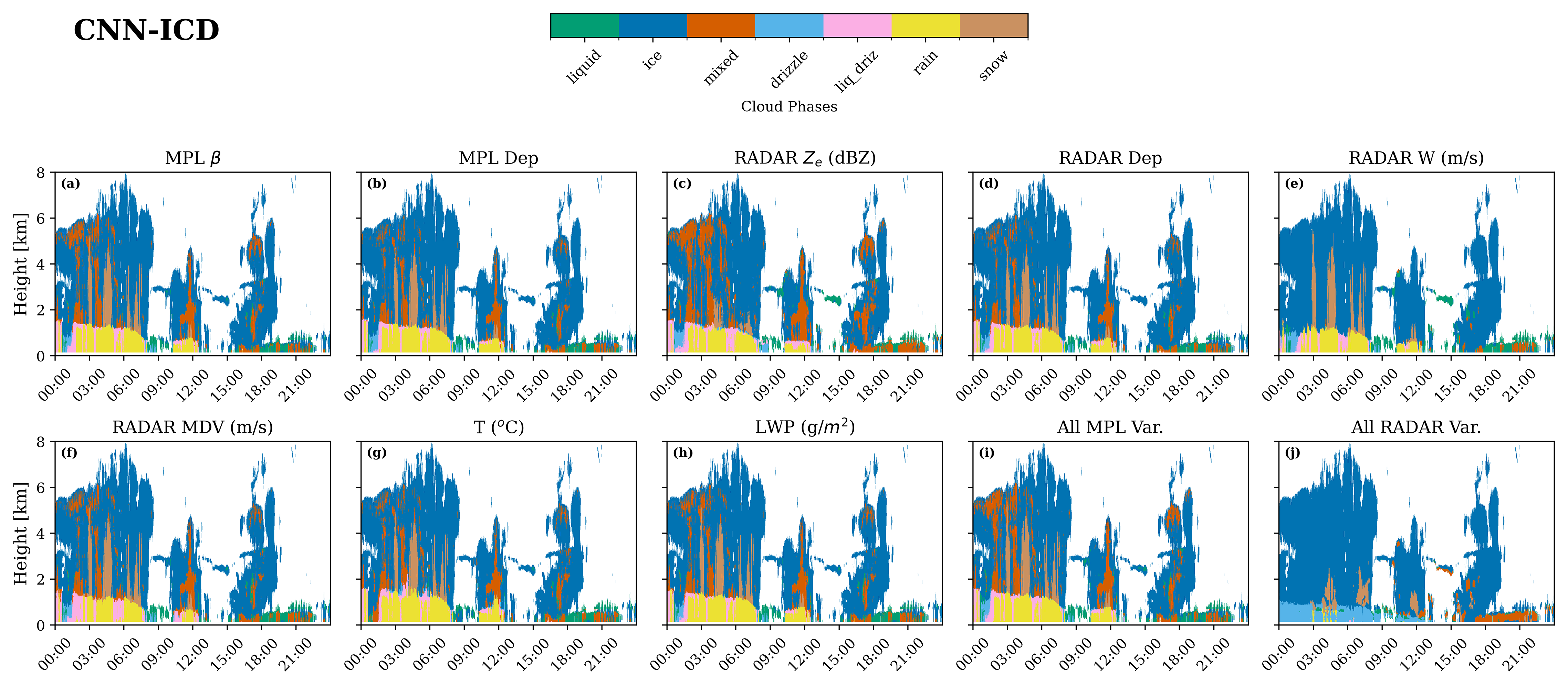 Figure 11 shows how the CNN-ICD model responds to the removal of different variables for predicting thermodynamic cloud phases for the same case shown in Fig. 10. Consistent with the input feature analysis shown in Fig. 8, removing the MPL β, MPL dep, radar dep, LWP, and all MPL variables has a minimal impact on the performance of the CNN-ICD model. When Ze is missing, the model sometimes fails to distinguish between liquid and drizzle for low-altitude cloudy pixels throughout the day and between ice and snow for mid- and high-level cloud pixels at the end of the day (Fig. 11c). Without radar W, the model sometimes fails to identify mixed-phase pixels for mid-level clouds, although they are only present for short periods in this example (Fig. 11e). Dropping out radar MDV causes the model to sometimes fail to distinguish between rain and drizzle between 03:00 and 06:00 UTC (Fig. 11f). Dropping out T causes the model to sometimes fail to distinguish between ice and liquid at the beginning of the day and between ice and drizzle at the end of the day (Fig. 11g). Overall, dropping out individual radar variables (including Ze, MDV, W), all radar variables simultaneously, or temperature data had the largest effect on predicting thermodynamic cloud phases. This general result is also true for the other ML models for this case study, which are detailed in Figs. S9 and S10. This result shows general agreement with the feature importance results presented in Sect. 3.3.