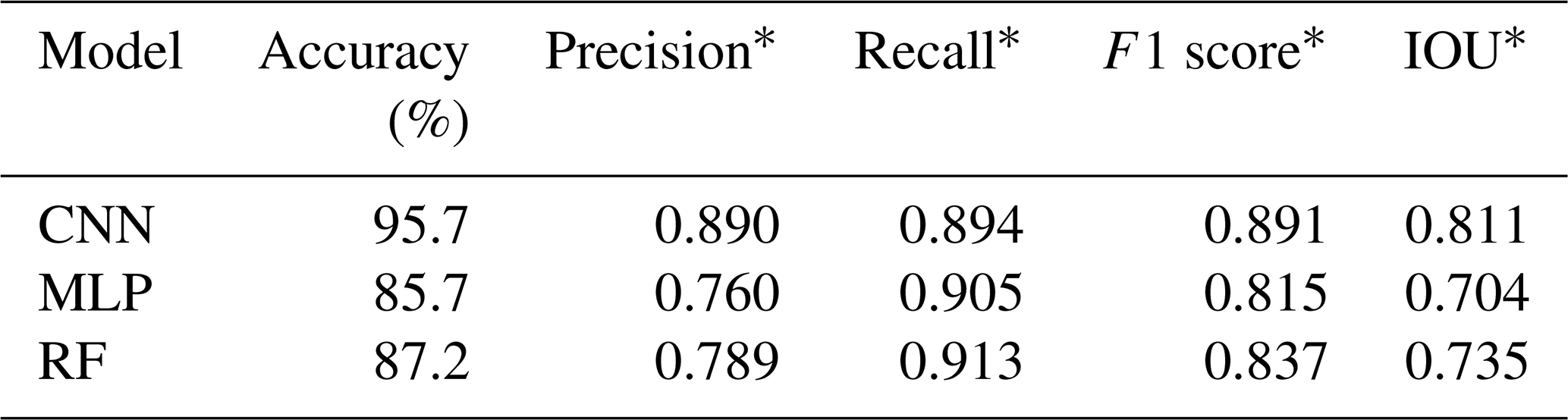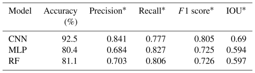Table 2 shows that each model agreed with the THERMOCLDPHASE VAP in more than 85 % of the utilized samples. The CNN achieved the highest test accuracy, F1 score, and mean IOU. The RF model performed slightly better than the MLP across these metrics but was significantly outperformed by the CNN. We hypothesize that the CNN's superior performance is due to its ability to evaluate the input time–height arrays (sections of data covering 11 km in height by 1 h) holistically rather than on a pixel-by-pixel basis. This approach allows the CNN to leverage information from neighboring pixels and potentially assess larger-scale features, such as cloud shape, to improve classification accuracy.