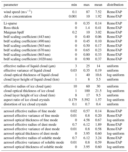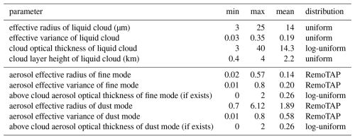 Table A3Details of the statistical distributions of the aerosol and cloud parameters used to generate the training datasets for NN forward model. The range of aerosol effective radius and effective variance for both fine mode and dust mode is smaller than that for the retrieval, because here it takes no extreme cases into account, which is relatively rare.